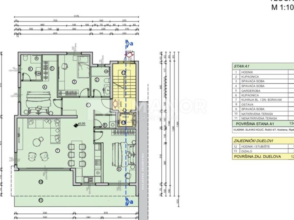 Manor predstavlja prostrani i moderno uređen 3S+DB stan s bazenom i dva parkirna mjesta. Stan se prostire na ukupnoj površini od 120 m i smješten je u mirnom dijelu Kostrene.