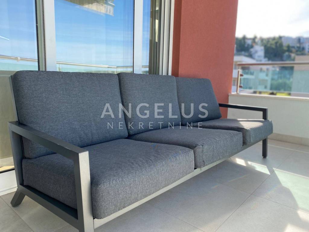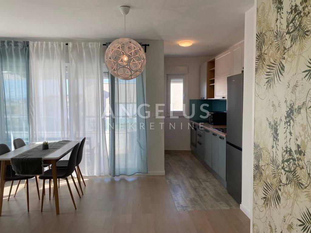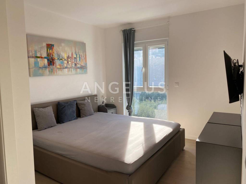 Ovaj prekrasan stan ukupne površine od 77 m2 smješten je na drugom katu male stambene zgrade. Stan se sastoji od dnevnog boravka, kuhinje i blagavoinice sa terasom, dvije spavaće sobe, dvije kupaonice, hodnika i još jedne sobe koja služi kao kao walk in ormar i sprema . Iz dnevnog boravka se izlazi na terasu sa koje se pruža prekrasan pogled. Raspored stana jako je lijep, orijentacije istok-zapad-jug. Stan je kompletno namješten i opremljen (perilica za rublje, klima uređaj u svakoj prostoriji, kuhinjski aparati, dva tv), uredan i održavan, te ima ugrađeno podno grijanje u kupaonama. U dvorištu zgrade nalazi se jedno parkirno mjesto koje je na raspolaganju budućem najmoprimcu. Vlasnici stana imaju još jedno parkirno mjesto kojeg je moguće dodatno iznajmiti.