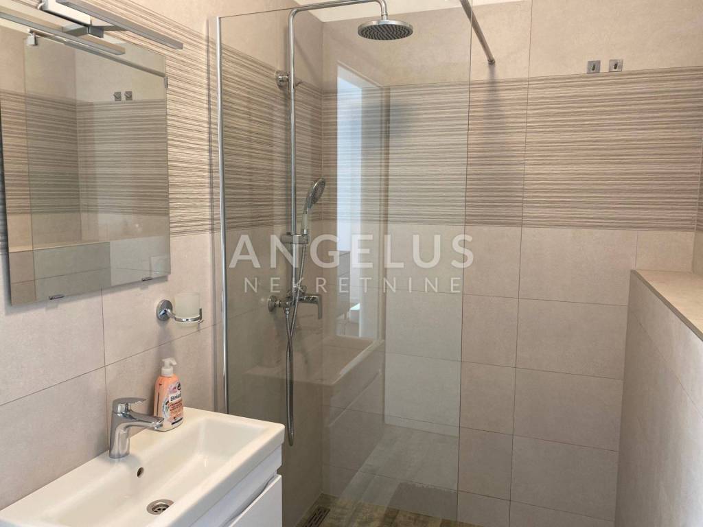 This beautiful apartment with a total area of 77 m2 is located on the second floor of a small residential building. The apartment consists of a living room, a kitchen and a dining room with a terrace, two bedrooms, two bathrooms, a hallway and another room that serves as a walk-in closet and storage. The living room opens onto a terrace with a beautiful view. The layout of the apartment is very nice, oriented east-west-south. The apartment is fully furnished and equipped (washing machine, air conditioner in every room, kitchen appliances, two TVs), neat and well maintained, and has built-in underfloor heating in the bathrooms. There is one parking space in the yard of the building, which is available to the future tenant. The owners of the apartment have another parking space that can be rented additionally.