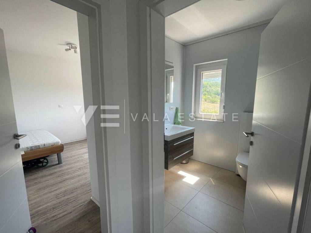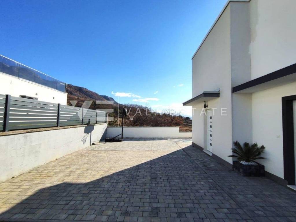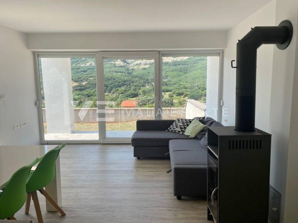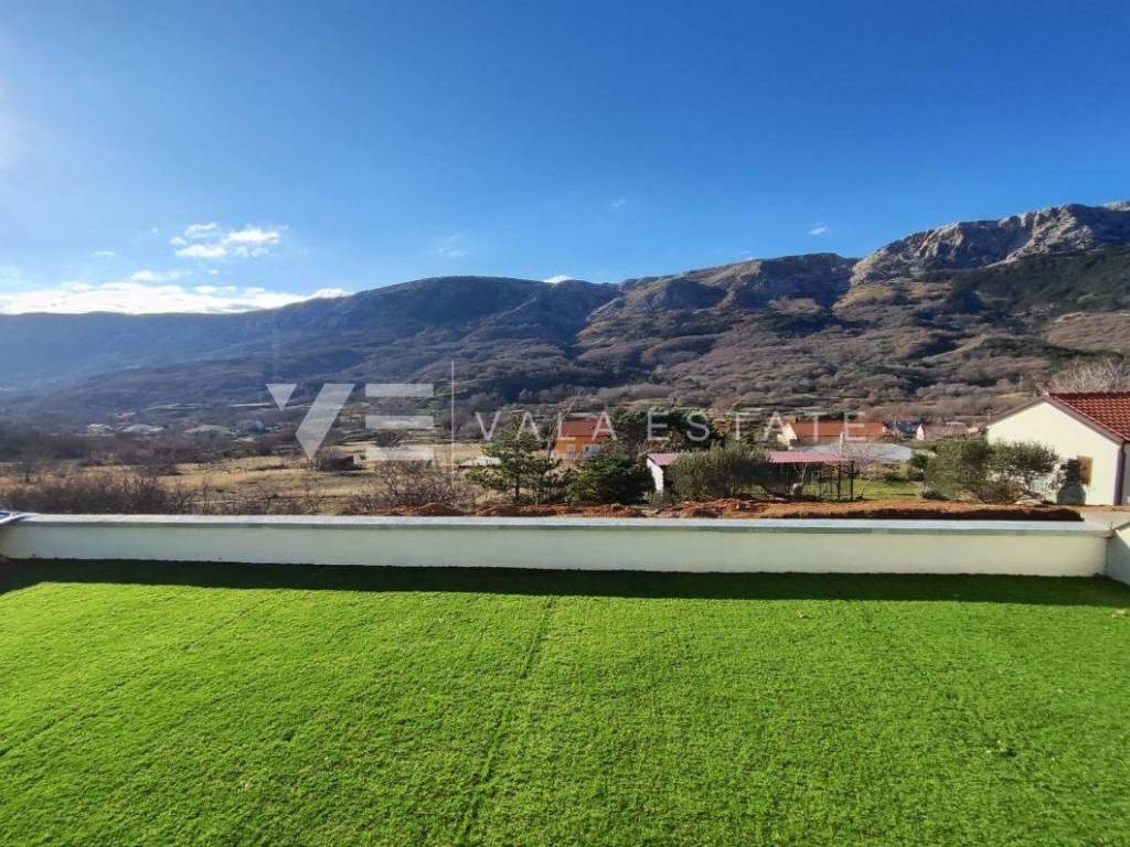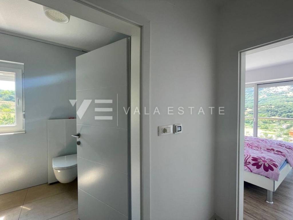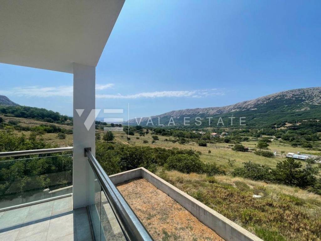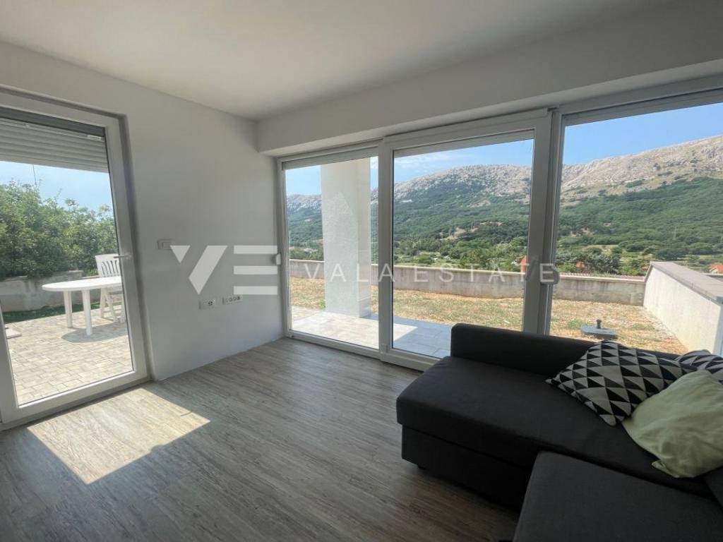 Nekretnine otok Krk, Baška okolica - na mirnoj lokaciji u okolici Baške, prodaje se nova moderna dvojna kuća koja zauzima 70 m2 stambene površine i raspoređena je na prizemlje i kat. U prizemlju se nalazi ulazni prostor, toalet te dnevni boravak s kuhinjom i blagovaonom s izlazom na natkrivenu terasu i okućnicu. Na katu koji je povezan unutarnjim stepenicama nalaze se dvije spavaće sobe od kojih jedna ima izlaz na terasu s lijepim pogledom na okolnu prirodu i kupaona. Potpuno je namještena novim modernim namještajem i kao takva se i prodaje. Za gradnju su se koristili kvalitetni materijali i oprema koji uključuju kvalitetne podne obloge, moderne sanitarije, multisplit klimatizaciju i ugrađenu visokokvalitetnu PVC stolariju. Pripadaju joj dva parkirna mjesta na ulaznom dijelu dvorišta. Ova lijepa i kvalitetna moderna novogradnja smještena je na mirnoj lokaciji udaljenoj 3000 m od lijepih plaža i svih sadržaja. Agencija Vala Estate Malinska će Vam omogućiti siguran i transparentan prijenos vlasništva i sve potrebne dokumentacije.