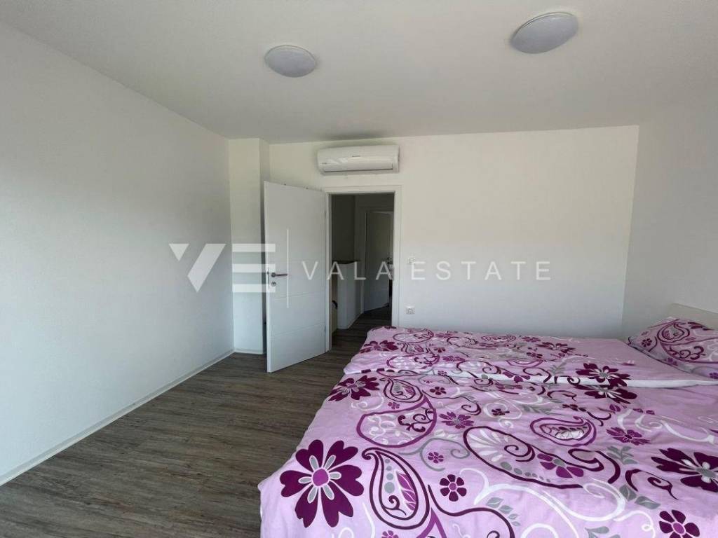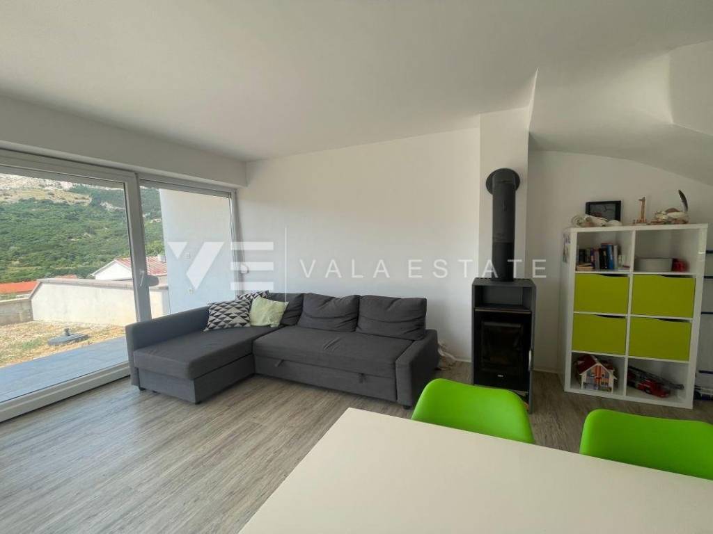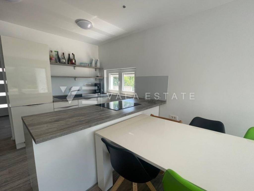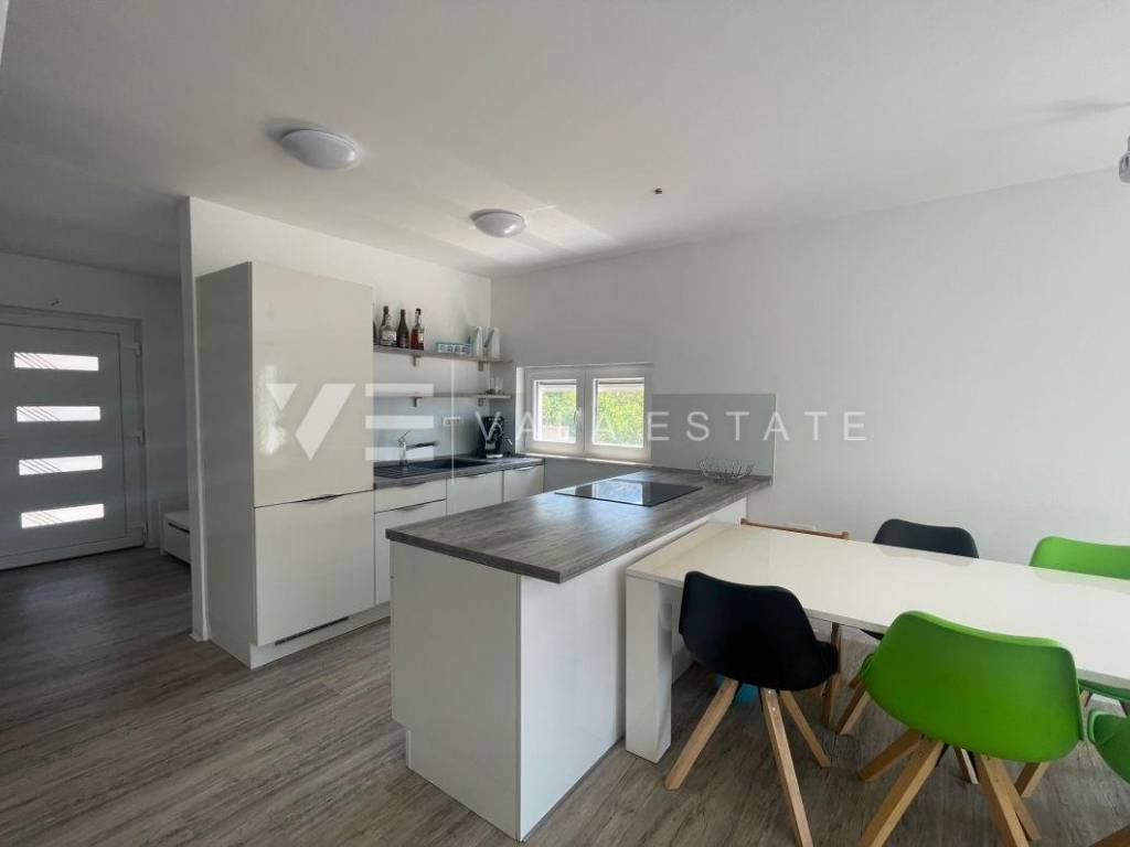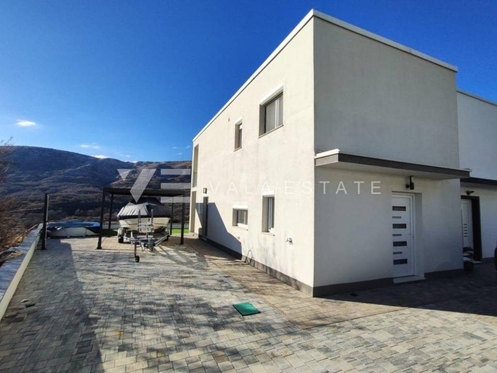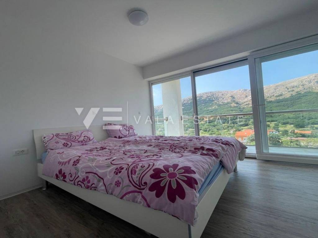 Nekretnine otok Krk, Baška okolica - na mirnoj lokaciji u okolici Baške, prodaje se nova moderna dvojna kuća koja zauzima 70 m2 stambene površine i raspoređena je na prizemlje i kat. U prizemlju se nalazi ulazni prostor, toalet te dnevni boravak s kuhinjom i blagovaonom s izlazom na natkrivenu terasu i okućnicu. Na katu koji je povezan unutarnjim stepenicama nalaze se dvije spavaće sobe od kojih jedna ima izlaz na terasu s lijepim pogledom na okolnu prirodu i kupaona. Potpuno je namještena novim modernim namještajem i kao takva se i prodaje. Za gradnju su se koristili kvalitetni materijali i oprema koji uključuju kvalitetne podne obloge, moderne sanitarije, multisplit klimatizaciju i ugrađenu visokokvalitetnu PVC stolariju. Pripadaju joj dva parkirna mjesta na ulaznom dijelu dvorišta. Ova lijepa i kvalitetna moderna novogradnja smještena je na mirnoj lokaciji udaljenoj 3000 m od lijepih plaža i svih sadržaja. Agencija Vala Estate Malinska će Vam omogućiti siguran i transparentan prijenos vlasništva i sve potrebne dokumentacije.