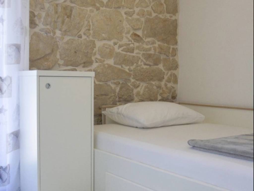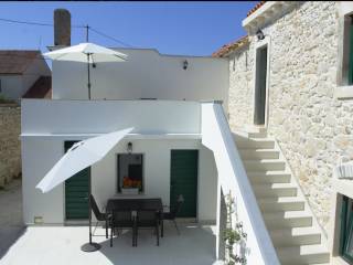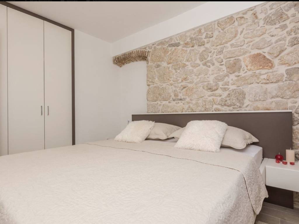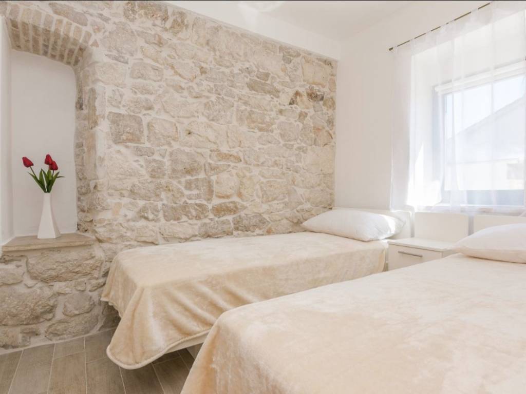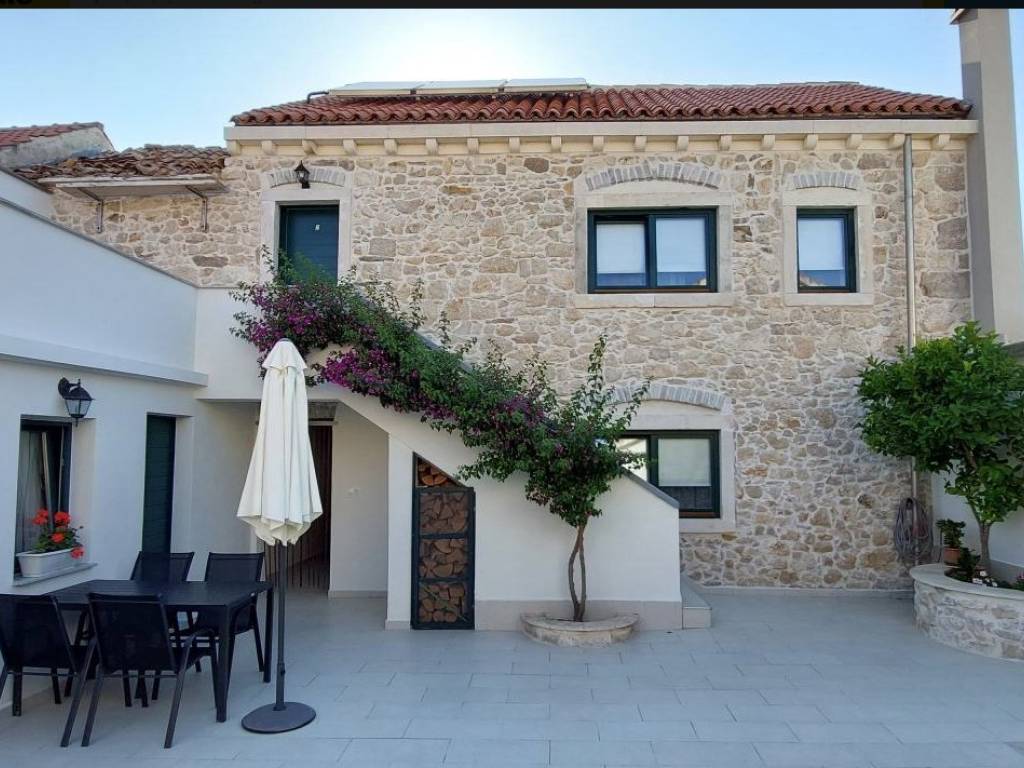 Iznimno kvalitetno renovirana kamena kuća 2018. godine (sagrađena 1967.g.), orginalni kameni zidovi od 60 cm, podno grijanje sa dizalicom topline, solarni kolektori za toplu vodu, konoba sa starinskim ognjištem ( isto sa podnim grijanjem), praona/vešeraj sa velikim spremnikom vode za solarne kolektore. Toplinska izolacija/fasada na sjevernoj/burnoj strani kao i sa unutarnje strane gdje je kamen izvana ( svugdje je sa suprotne strane kamena toplinska izolacija). Sastoji se od prizemlja, sa dvosobnim apartmanom, plus crna kuhinja, kotlovnica, wc i pušnica. Na katu je još jedan dvosoban apartman plus dvije velike terase (tlocrti u privitku). Dvorište od 45 m2. Nema privatni parking ali je moguće parkiranje u dvoru i sa manjim zahvatom je moguće dobijanje još jednog parkirnog mjesta. Kuća se nalazi u mirnoj ulici, 400 m od plaže. Uhodani apartmani koji su puni cijelu sezonu. Gradska kanalizacija je izgrađenja ali još nije izvršeno priključenje na razini cijelog mjesta. Sva dokumentacija uredna. Za više informacija kontaktirajte agenciju.