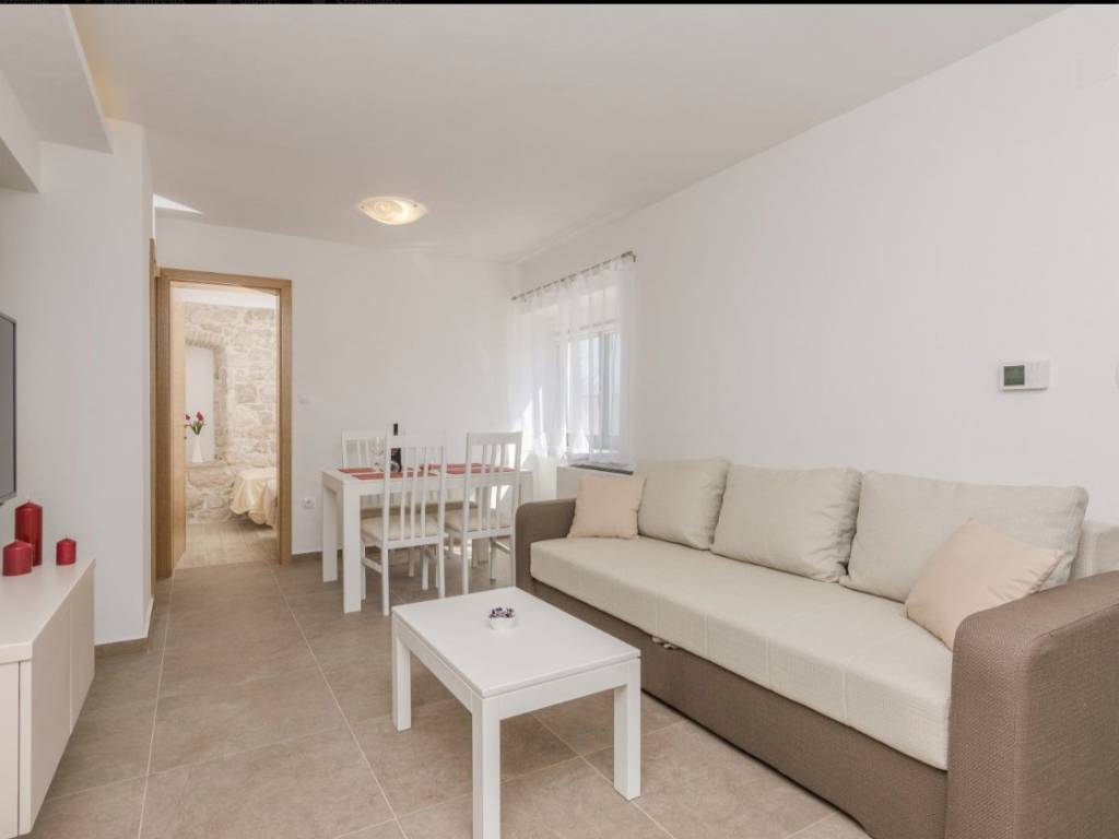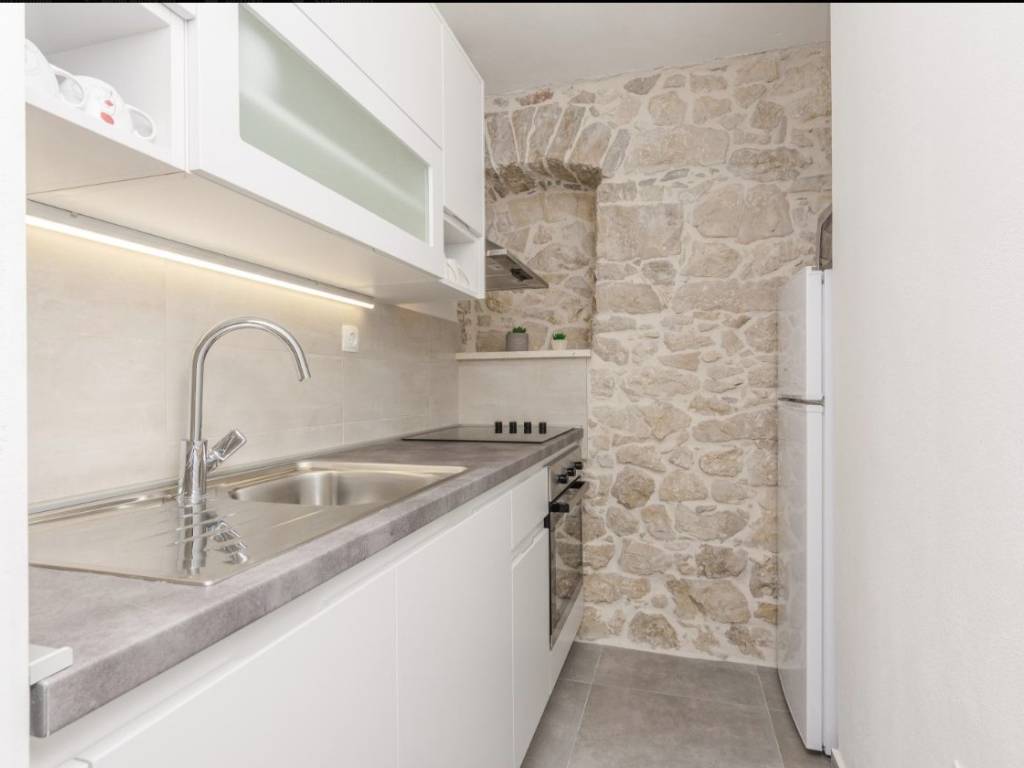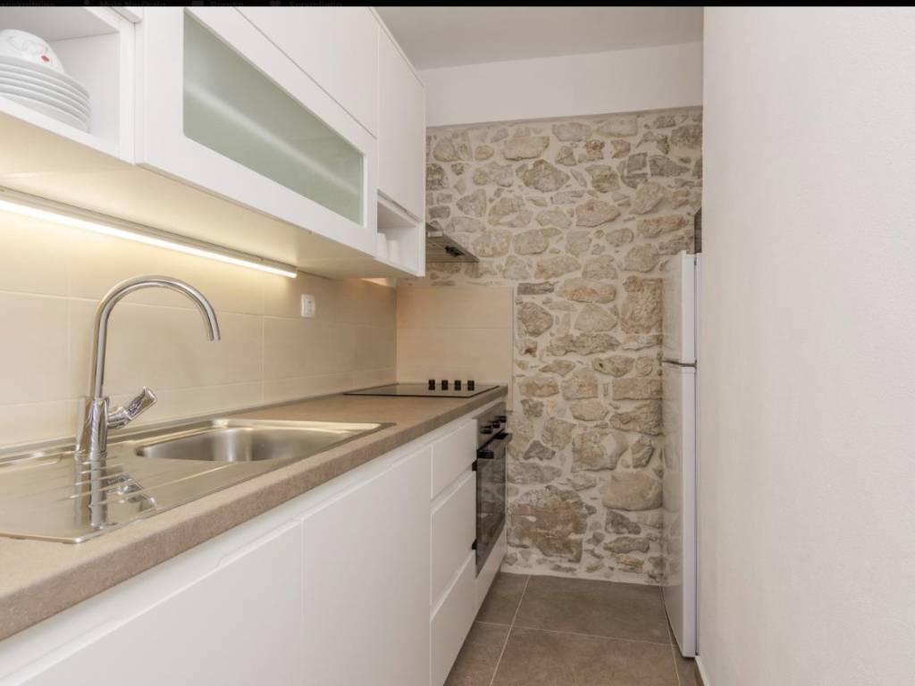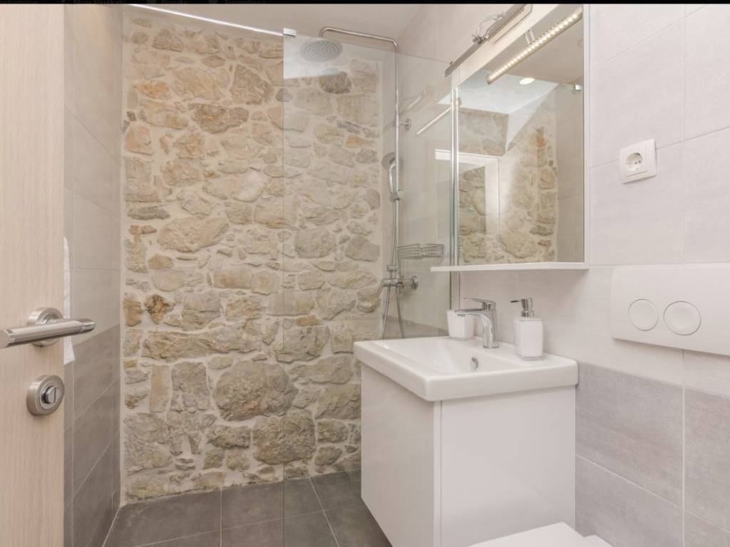 Iznimno kvalitetno renovirana kamena kuća 2018. godine (sagrađena 1967.g.), orginalni kameni zidovi od 60 cm, podno grijanje sa dizalicom topline, solarni kolektori za toplu vodu, konoba sa starinskim ognjištem ( isto sa podnim grijanjem), praona/vešeraj sa velikim spremnikom vode za solarne kolektore. Toplinska izolacija/fasada na sjevernoj/burnoj strani kao i sa unutarnje strane gdje je kamen izvana ( svugdje je sa suprotne strane kamena toplinska izolacija). Sastoji se od prizemlja, sa dvosobnim apartmanom, plus crna kuhinja, kotlovnica, wc i pušnica. Na katu je još jedan dvosoban apartman plus dvije velike terase (tlocrti u privitku). Dvorište od 45 m2. Nema privatni parking ali je moguće parkiranje u dvoru i sa manjim zahvatom je moguće dobijanje još jednog parkirnog mjesta. Kuća se nalazi u mirnoj ulici, 400 m od plaže. Uhodani apartmani koji su puni cijelu sezonu. Gradska kanalizacija je izgrađenja ali još nije izvršeno priključenje na razini cijelog mjesta. Sva dokumentacija uredna. Za više informacija kontaktirajte agenciju.