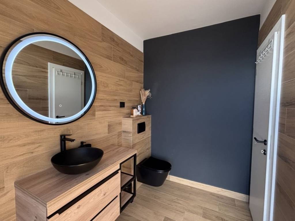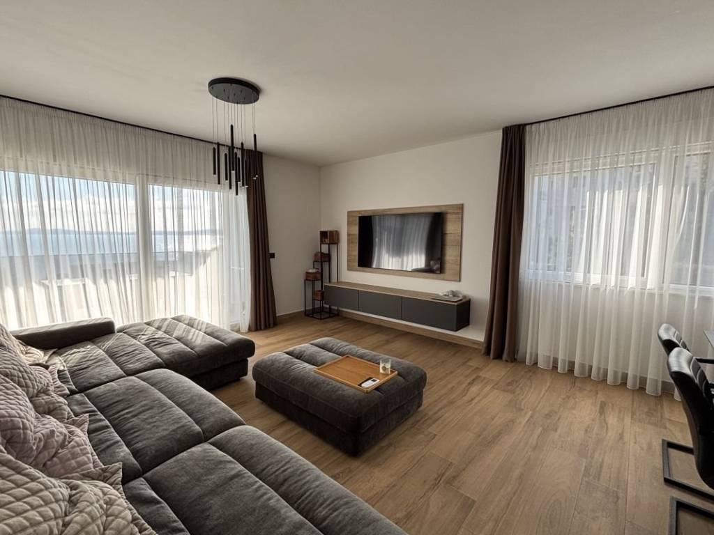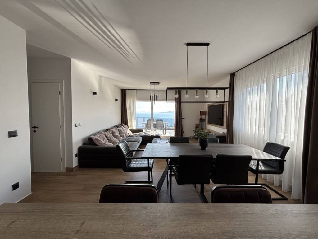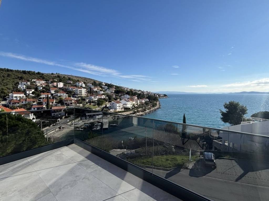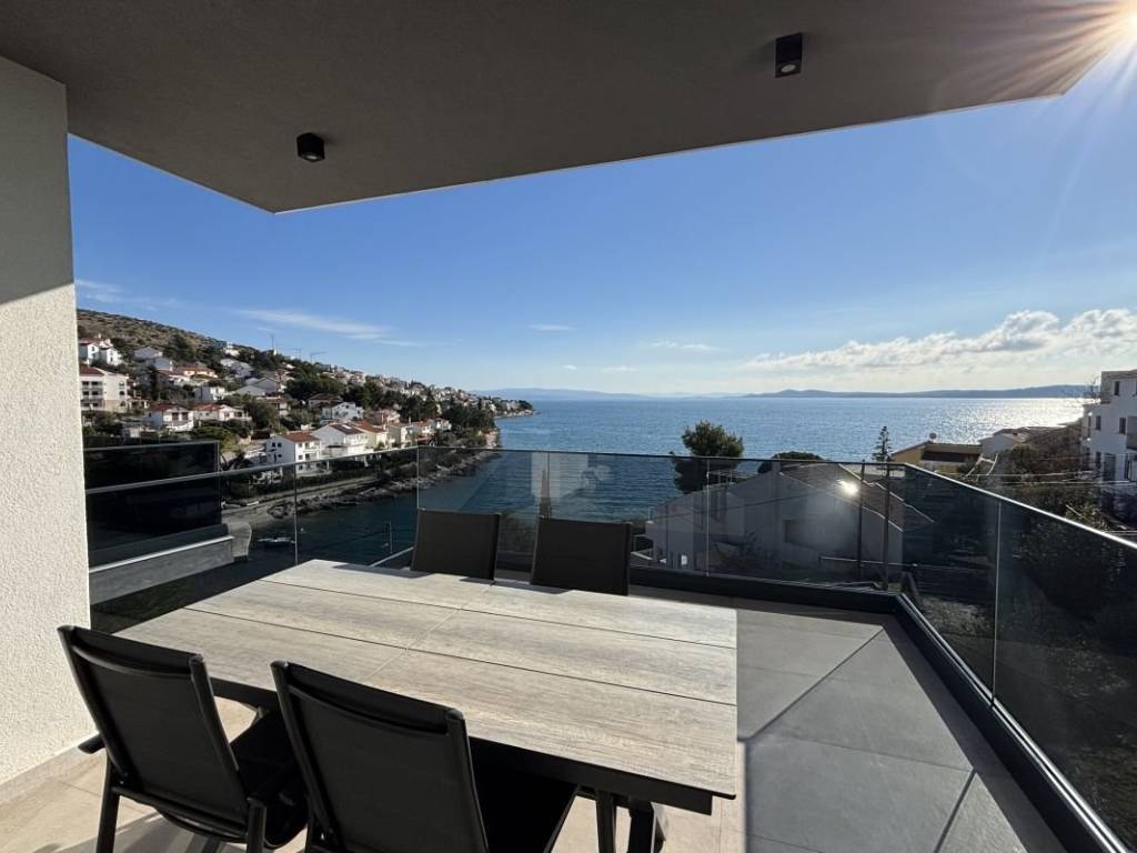 U ponudi je moderan i iznimno atraktivan trosoban penthouse s bazenom u novogradnji, smješten u Okrugu Gornjem, u prvom redu do mora. Ova elegantna nekretnina nalazi se na drugom katu manje stambene zgrade, na mirnoj mikrolokaciji okruženoj zelenilom, pružajući savršenu ravnotežu privatnosti i mediteranskog ugođaja. Stan obuhvaća 110 m² pažljivo osmišljenog stambenog prostora te dodatnih 28 m² vanjskih površina. Prostrani i obiljem prirodnog svjetla ispunjen dnevni dio objedinjuje kuhinju, blagovaonicu i dnevni boravak, iz kojeg se izlazi na prostranu lođu i natkrivenu terasu s otvorenim panoramskim pogledom na more. Nekretnina raspolaže s tri udobne spavaće sobe, pri čemu se master spavaća soba ističe vlastitom kupaonicom s pogledom na more, elegantnim walk-in ormarom te privatnom natkrivenom terasom. Stan dodatno nudi još jednu moderno uređenu kupaonicu, gostinjski toalet i funkcionalnu praonicu. Posebna vrijednost ove nekretnine leži u iznimnoj razini privatnosti, prostranom vanjskom prostoru i spektakularnom pogledu na more koji se pruža iz gotovo svakog kutka stana, stvarajući osjećaj luksuza i potpune opuštenosti. Sve prostorije opremljene su klima uređajima, dok podno grijanje osigurava maksimalnu udobnost tijekom cijele godine. Stan se iznajmljuje potpuno namješten i opremljen, a pripadaju mu i dva vanjska parkirna mjesta. Od dodatne opreme ističu se protuprovalna vrata, električni podizači roleta i videonadzor. Ispred zgrade nalazi se bazen sa sunčalištem i impresivnim pogledom na more. Ova nekretnina predstavlja idealan izbor za one koji traže sofisticiran, moderan i bezbrižan način života uz more, s kompletnom infrastrukturom i svim potrebnim sadržajima na svega 300 metara udaljenosti, dok je zračna luka dostupna unutar približno 9 kilometara.