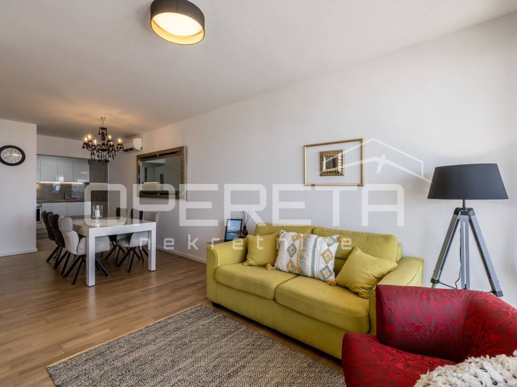Stan je potpuno namješten i opremljen modernim uređajima i kvalitetnim materijalima, a pažljivo osmišljeni detalji stvaraju toplu i ugodnu atmosferu. Južna orijentacija osigurava obilje prirodnog svjetla tijekom cijelog dana. Uz stan dolazi i pripadajuće garažno parkirno mjesto površine 18 m² u zatvorenoj garaži, što dodatno doprinosi praktičnosti i sigurnosti.
