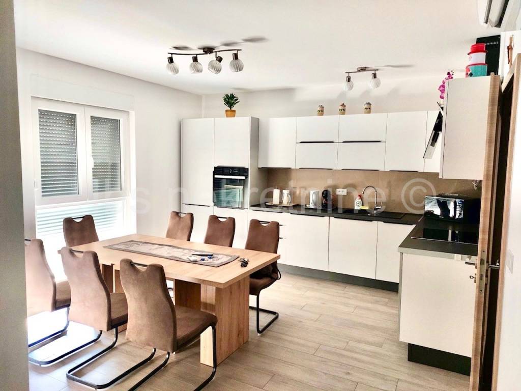 Na prodaju je izuzezno kvalitetan i moderno uređen trosoban stan netto površine 71,52 m2, s koeficijentima pripadaka površine 80 m2. Smješten je u Podstrani, u novijoj stambenoj zgradi izgrađenoj 2021. godine. Nalazi se na prvom od ukupno dva kata zgrade.