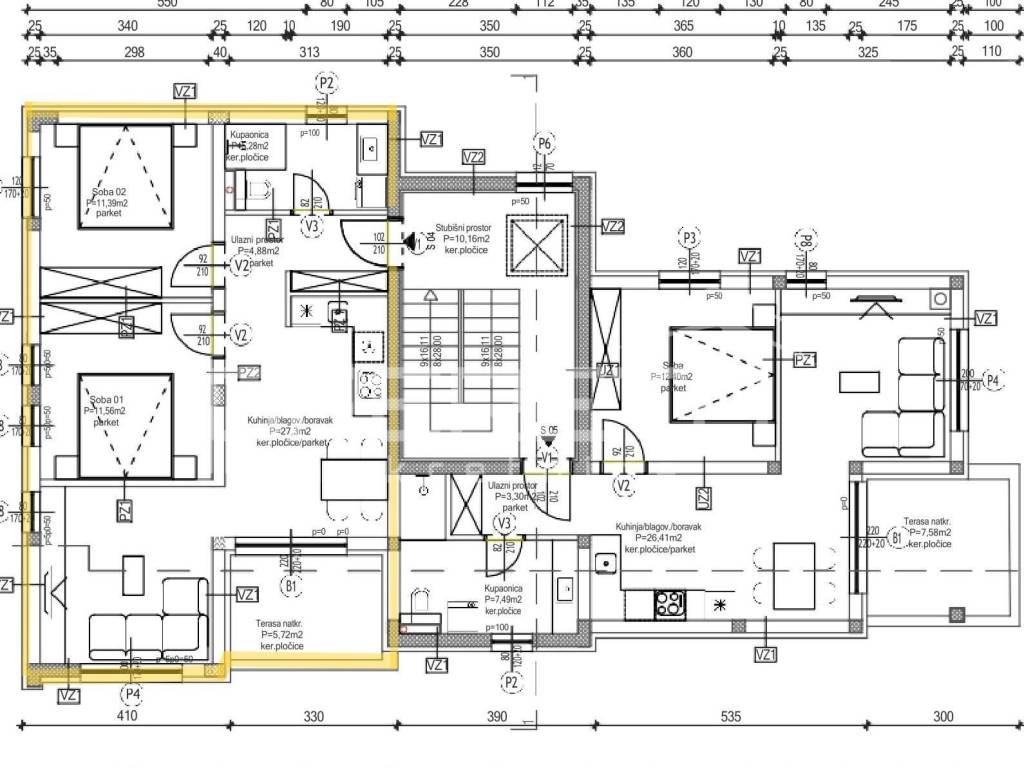 Stan će biti opremljen kvalitetnom keramikom, električnim podizačima roleta, podnim grijanjem u kupaonicama te s dva klima uređaja, što osigurava maksimalnu udobnost tijekom cijele godine.
