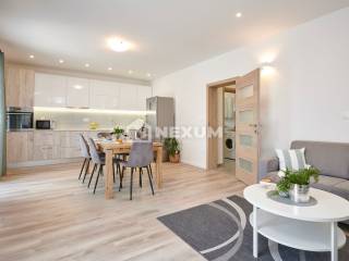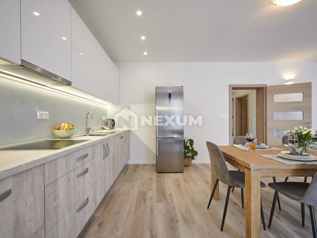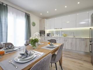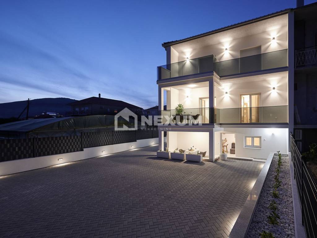 Na prvom katu se nalazi dvosoban apartman od 80m2 koji se sastoji od kuhinje, blagovaonice, dnevnog boravka, dvije spavaće sobe i dvije kupaonice, te terase od 20m2.