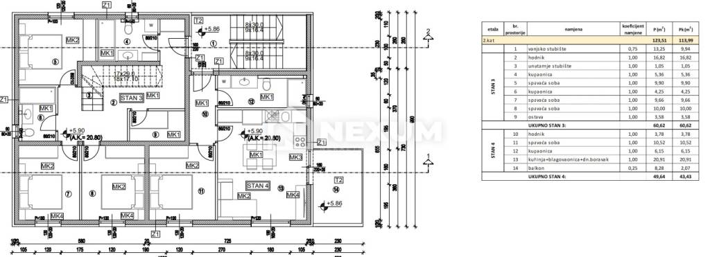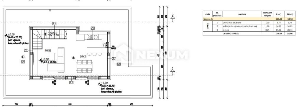 Stan oznake S3 nalazi se na drugom katu manje zgrade te ima ukupnu neto korisnu površinu od 180,51m2 od čega unutarnja površina stana iznosi 99,19 m2, a površina terase 81,32m2.
