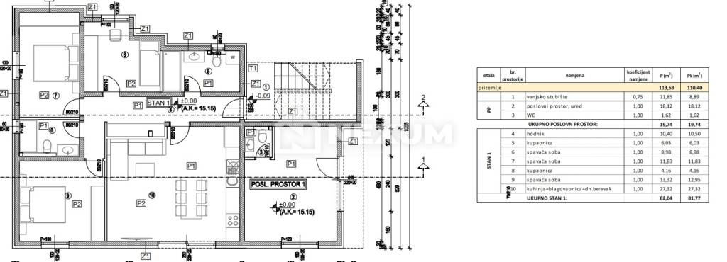 Stan oznake S1 nalazi se u prizemlju manje zgrade te ima ukupnu neto korisnu površinu od 82,04.