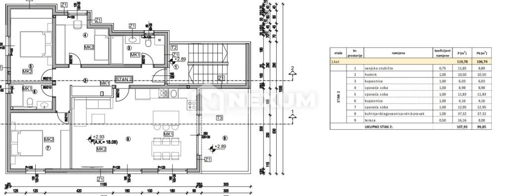 Stan oznake S2 nalazi se na prvom katu zgrade te ima ukupnu neto korisnu površinu od 107,93m2 od čega unutarnja površina stana iznosi 91,77 m2, a površina terase 16,16 m2. Stan se sastoji od tri spavaće sobe, dvije kupaonice, hodnika, dnevnog boravaka s kuhinjom i blagovaonom te prostrane terase.