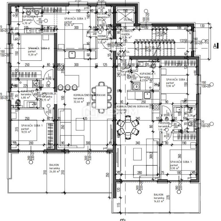 Na prodaju je prostrani trosoban stan oznake S7 ukupne površine 123m2, od čega unutarnji dio stana ima površinu 83,30m2, dok površina balkona iznosi 24,20m2, a površina krovne terase iznosi 109,60m2