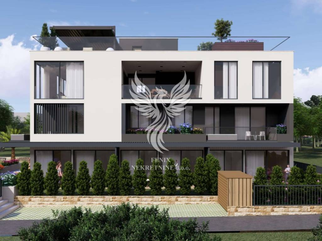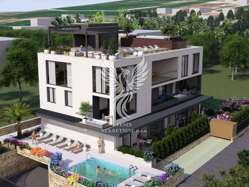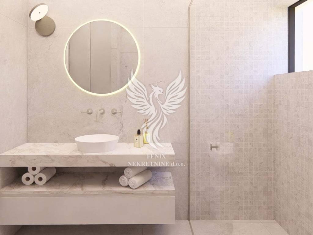 Sam stan se nalazi na drugom katu i sastoji se od hodnika, ulaznog hola, dviju kupaonica, wc-a, vešeraja, četiriju soba (jedna master), kuhinje s blagovaonicom i dnevnim boravkom i lođe, te stubišta i prostrane krovne terase. Sve kupaonice imaju podno grijanje, a u svaku prostoriju će biti postavljena i klima. Zgrada ima lift. Uz stan se kupuje garažno mjesto.
