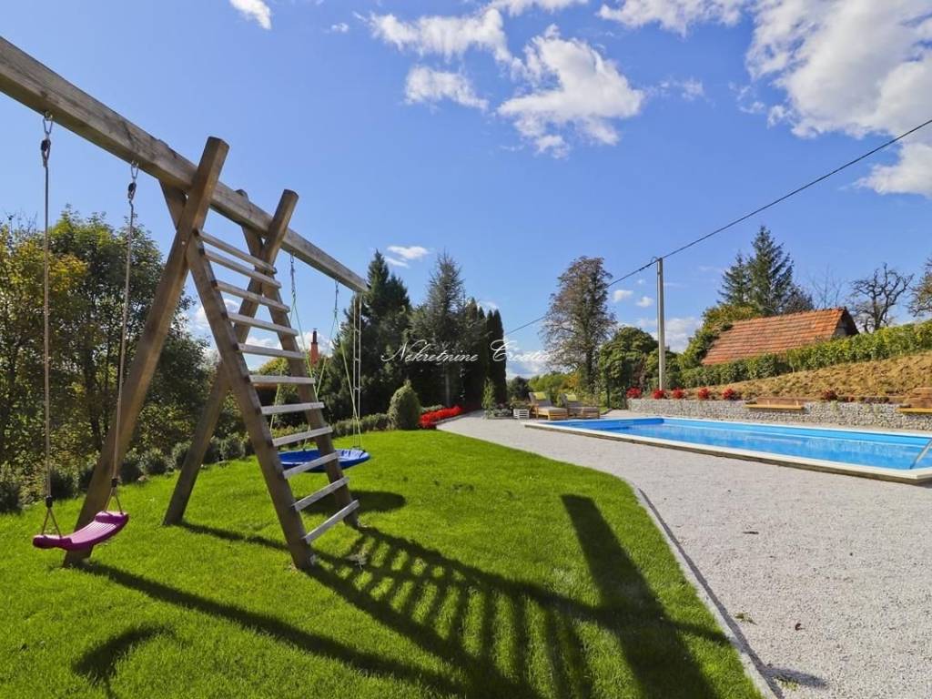 80 km od Zagreba: superkomforna vila od 200 m2 stambene površine, sa 3 terase od ukupno 100 m2, velikim bazenom (neto površine 50 m2) i pomoćnim objektom uz bazen (65 m2), u prekrasnom krajoliku i apsolutnom miru, okružena zelenilom, na površini od 3.223 m2!