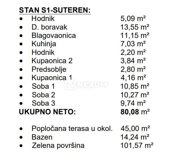 Stan oznake S1 neto površine 80.08m2 sastoji se od tri prostrane spavaće sobe, dvije kupaonice, hodnika, kuhinje, blagovaonice te dnevnog boravka iz kojeg se izlazi u prostrani vrh s bazenom. Stanu pripadaju dva vanjska parking mjesta koja su uključena u cijenu.
