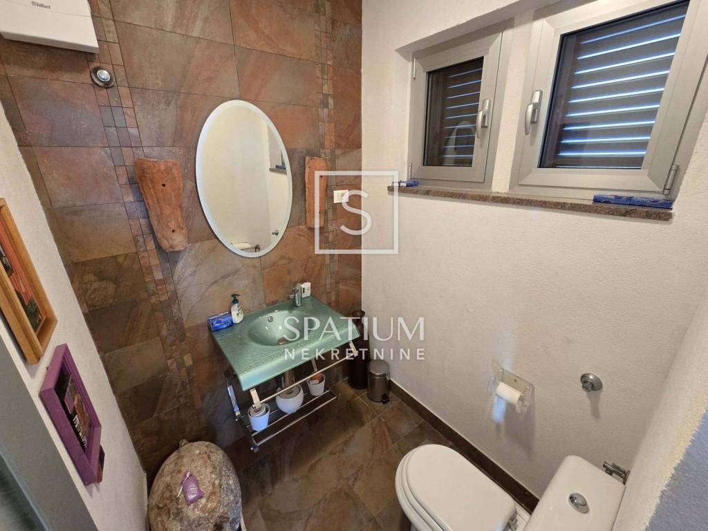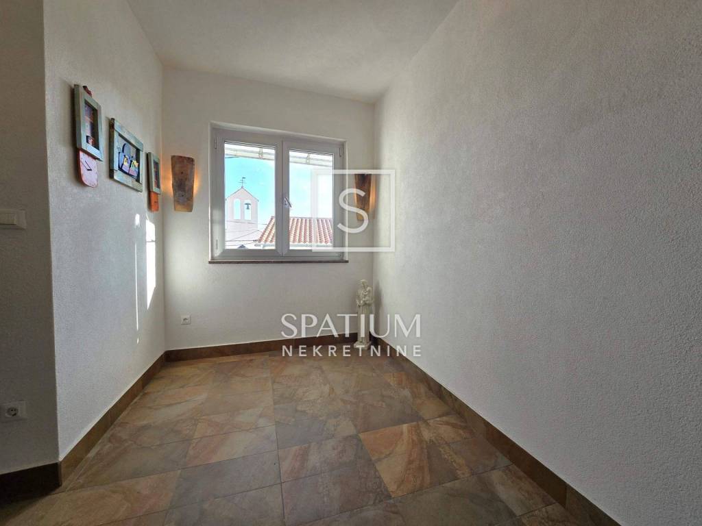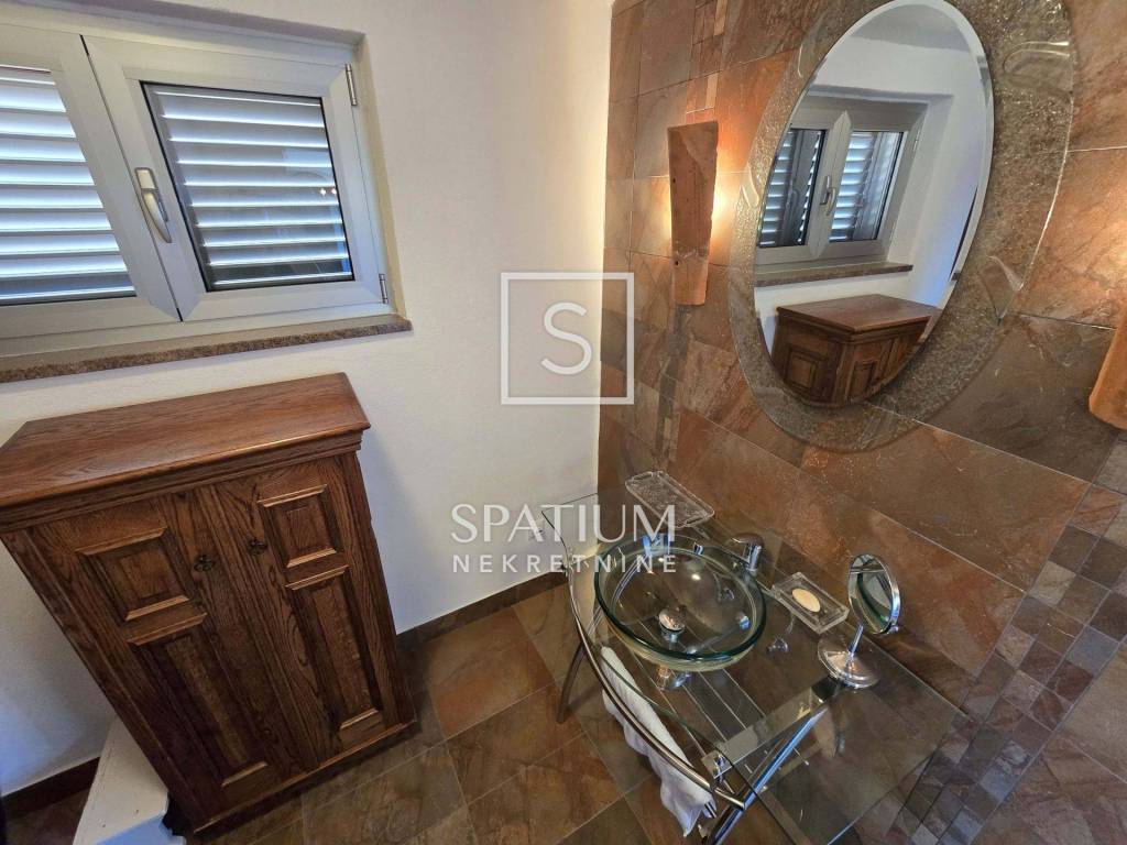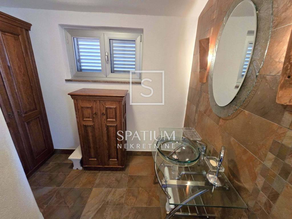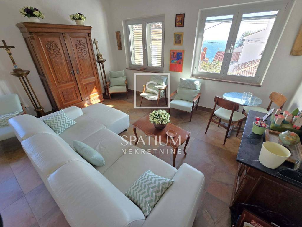 MOŠĆENIČKA DRAGA, KRAJ, u ponudi je kuća smještena u staroj jezgri. Sveukupna površina od otprilike 120 m2 raspoređena je na tri etaže. U prizemlju je garaža u sklopu koje je praonica i ostava te konoba za druženje s odvojenim ulazom s toaletom. Vanjske stepenice vode na kat gdje se ulazi u stambeni prostor na dvije etaže. Na donjoj se nalazi dnevni boravak s kuhinjom i blagovaonom, toalet te prostorija koja se može koristiti kao spavaća soba ili kao blagovaona. Unutarnje stepenice vode u predsoblje gdje je garderobni ormar, kupaona te velika spavaća soba. Vanjska je stolarija aluminijska a za grijanje odnosno hlađenje postavljeni su Daikin klima uređaji na svakoj etaži. Ova je nekretnina vrlo specifična kako zbog svoje prekrasne lokacije tako i zbog puno prozorskih otvora kojim se interijer stapa s morskim plavetnilom. Iz svih se prostorija pruža lijep pogled na Kvarnerski zaljev i na Grad Rijeku. Uređenje i opremanje prostora odiše toplinom a kompletan namještaj, oprema i ukrasni detalji ostaju u cijeni kuće. Skrovite plaže nalaze se na nekoliko minuta udaljenosti od kuće.