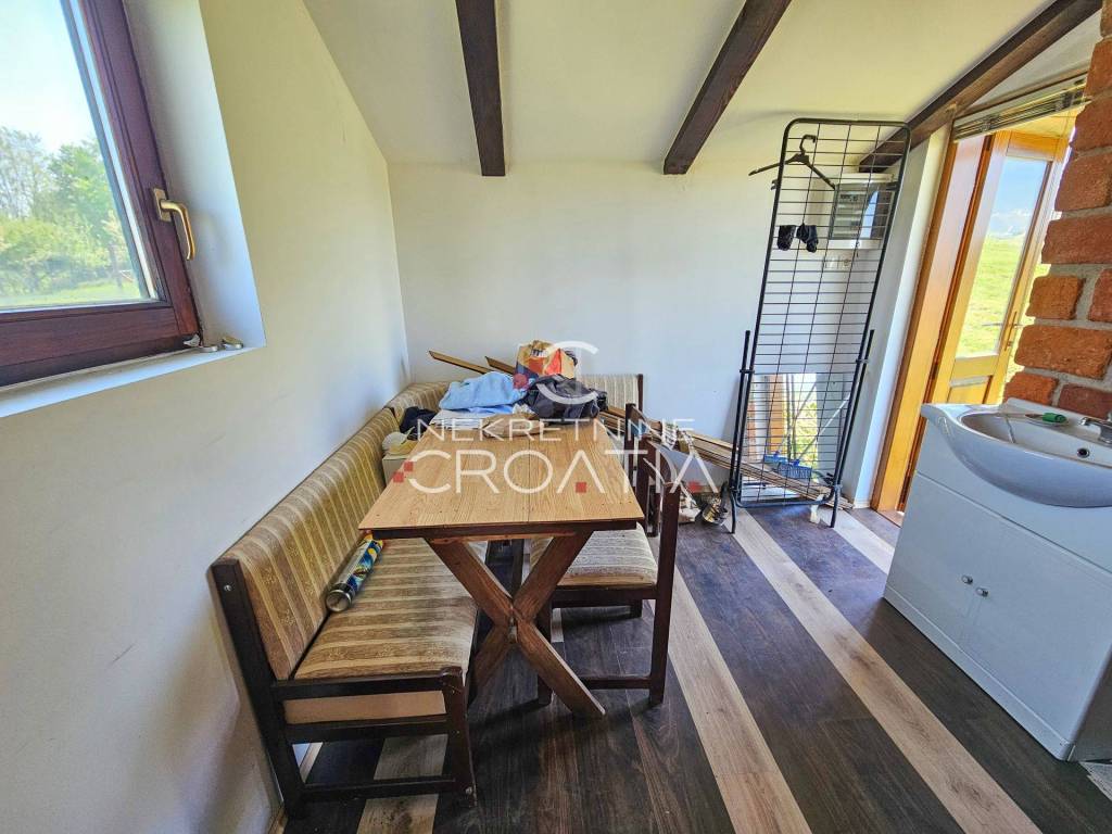 Mala kuća za odmor sa velikim potencijalom. Površine 22 m2 na zemljištu koje se nalazi cijelim obujmom u građevinskoj zoni stambene namjene, sa blagim nagibom na zapad. Priključak struje i vode. Drvena vanjska stolarija sa izo staklima, krovna obloga crijep.