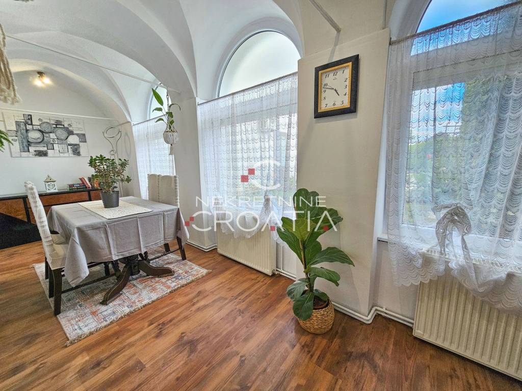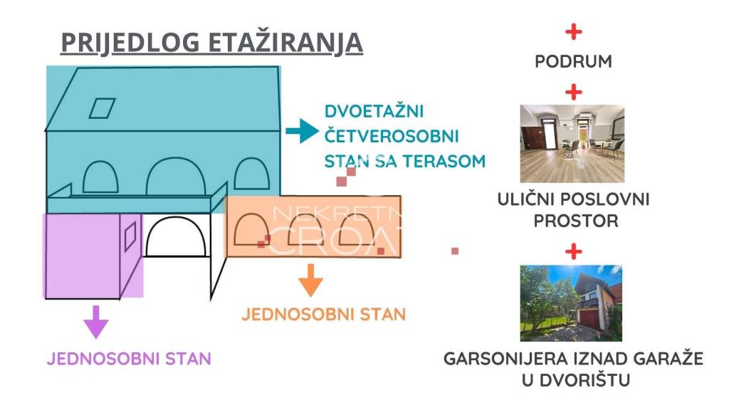 DVOETAŽNI STAN 129 m2 sa predivnom terasom + tavan + 2 JEDNOSOBNA STANA u prizemlju 80 m2 + BOLTANI PODRUM 68 m2 + GARSONIJERA SA GARAŽOM 53 m2 + ULIČNI POSLOVNI PROSTOR 31 m2: A) sa dugoročnim najmoprimcima već sad donosi 600 € mjesečno! B) mogućnost proširenja i spajanja poslovnog prostora sa uličnim ulazom sa ostatkom nekretnine bez velikih troškova rušenja nosivih zidova- već postoji otvor koji je trenutno pregrađen knaufom!