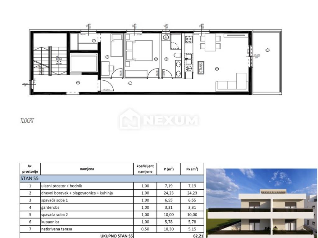 Na prodaju je funkcionalan dvosobni stan s ukupnom stambenom površinom od 57,06 m², kojem pripada i natkrivena terasa od 10,30 m², idealna za uživanje na otvorenom u bilo kojem vremenu.