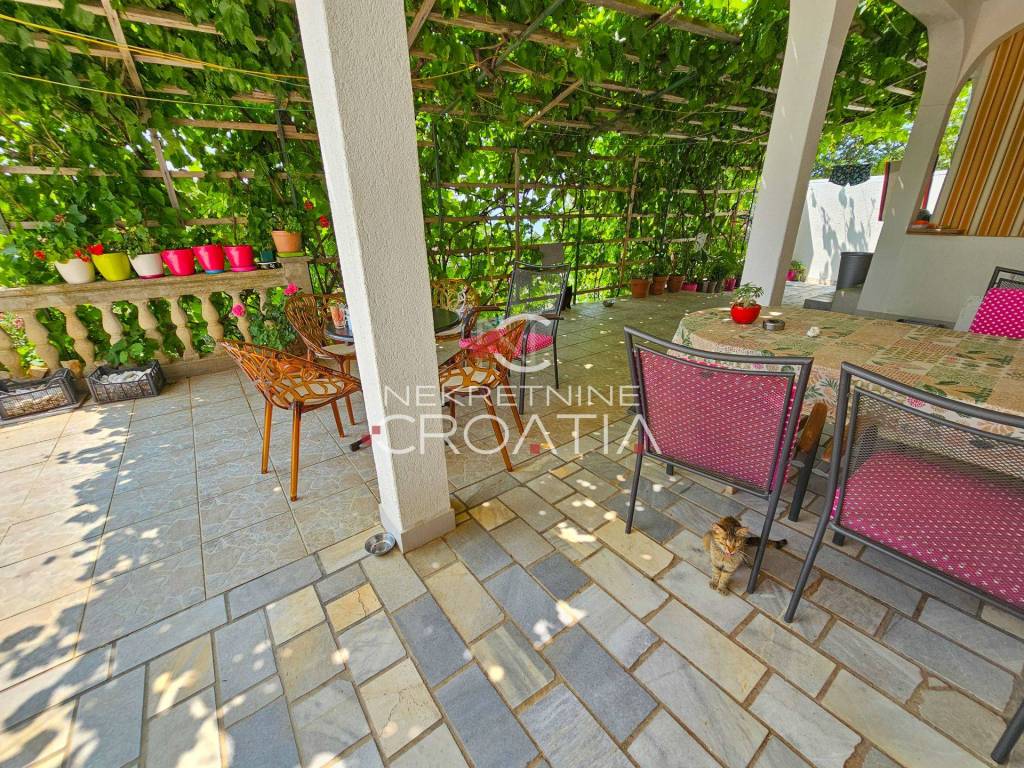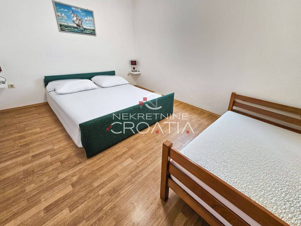 Neposredno uz more (10 m!) i odvojenu, zasebnu plažu: samostojeći višestambeni objekt ukupne površine 476 m2 sa 9 apartmana, garažom i vlastitim parkingom te jedinstvenim, panoramskim pogledom na more iz svakog apartmana i okućnice!