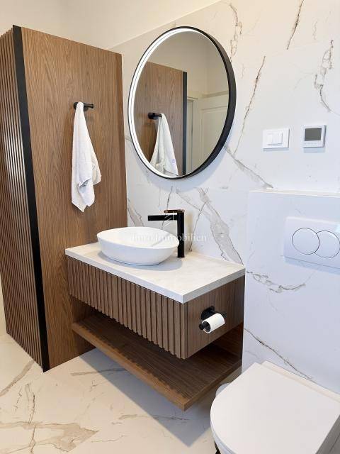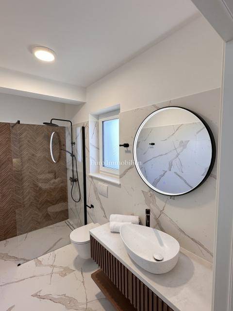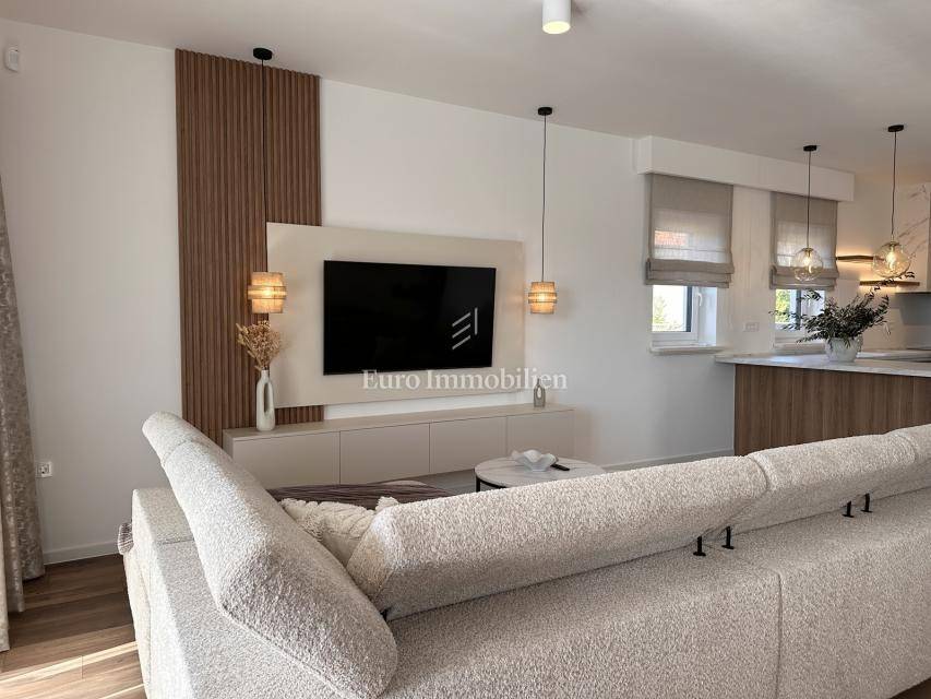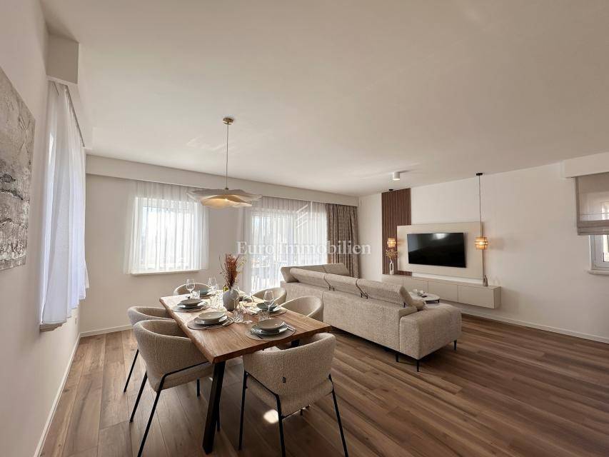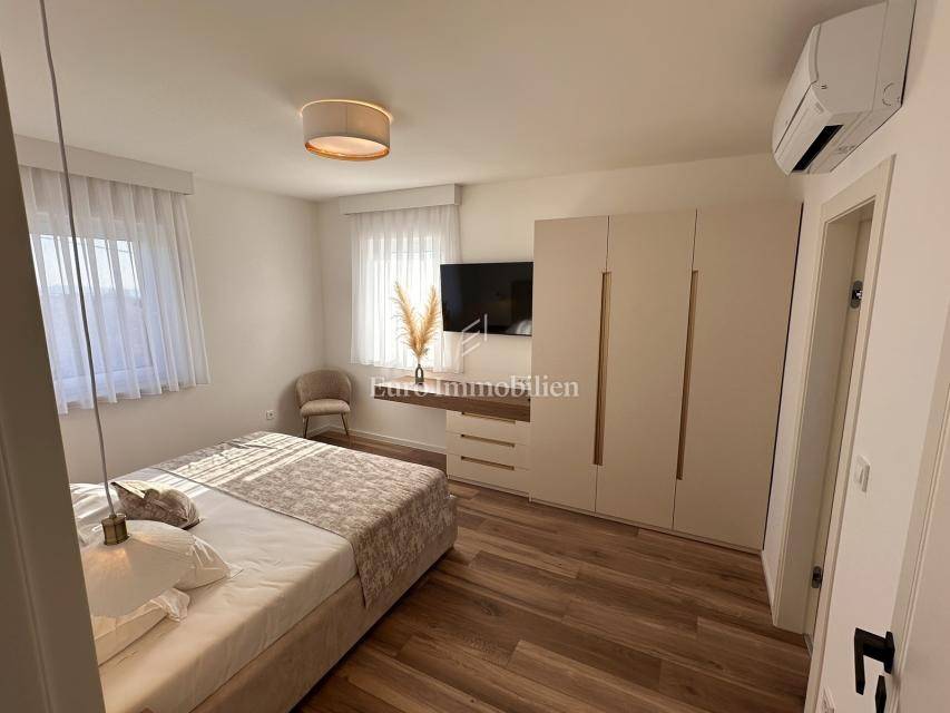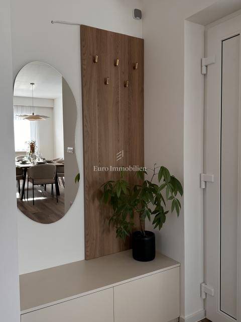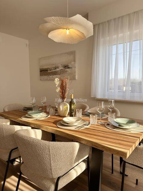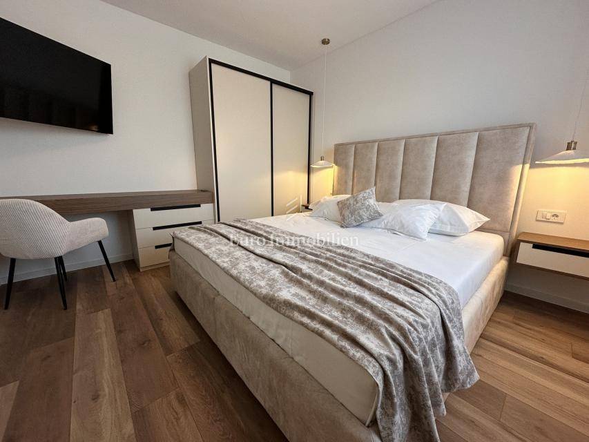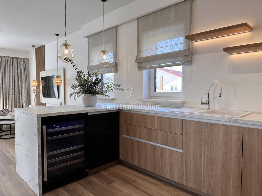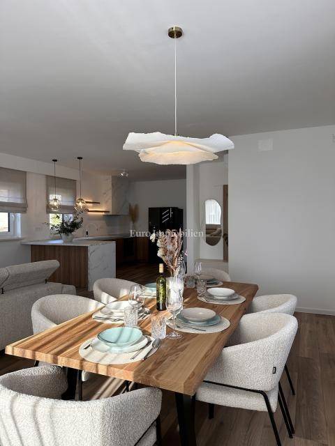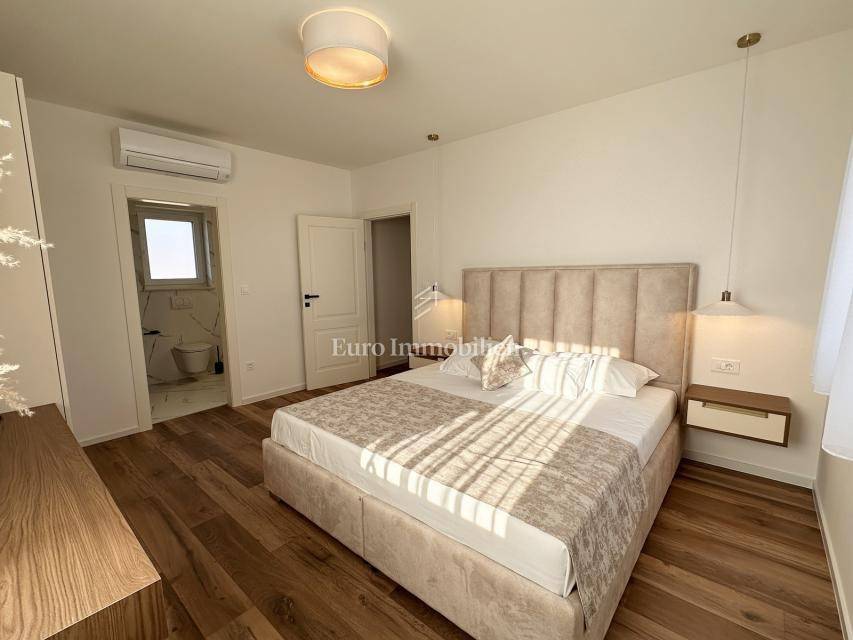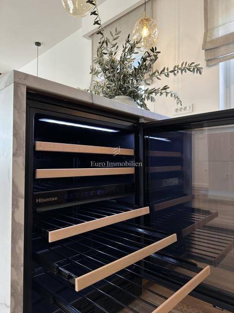 Nekretnina je opremljena dizajnerskim namještajem, prvoklasnom keramikom, visokokvalitetnom stolarijom i vrhunskim sanitarijama renomiranih proizvođača. Sve prostorije su klimatizirane te su namještaj i kućanski aparati uključeni su u cijenu.