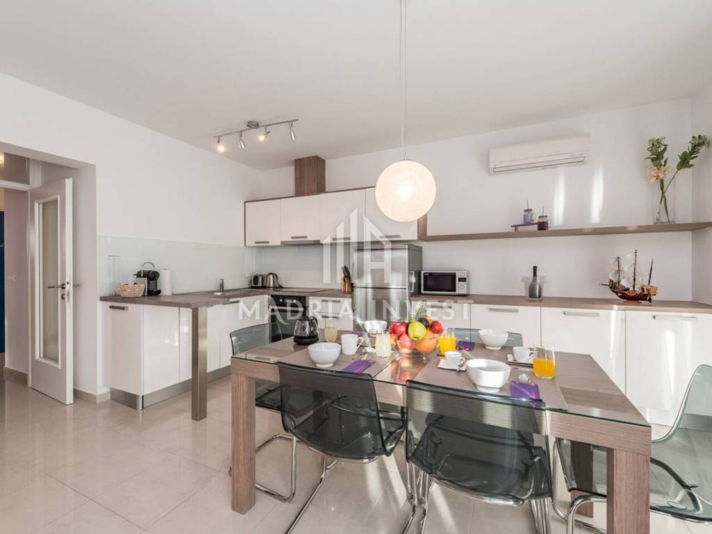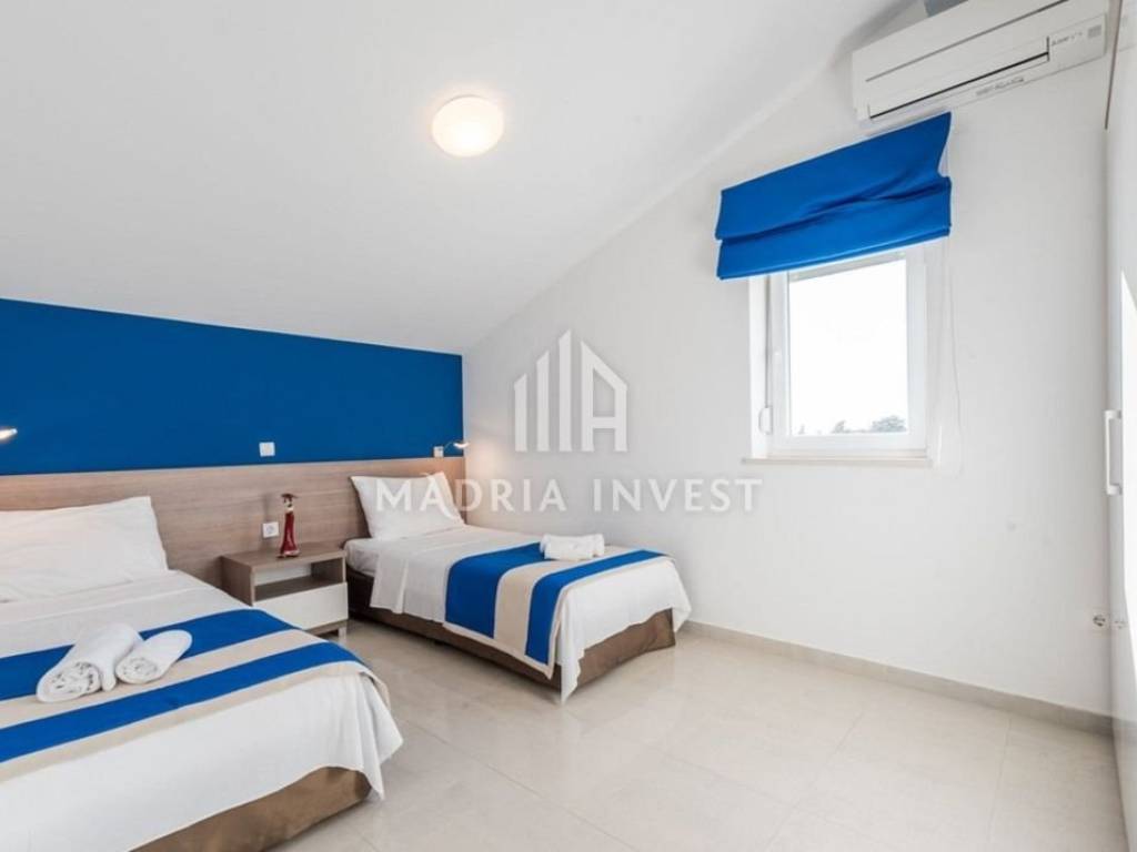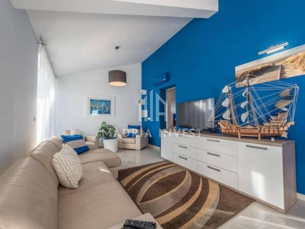 Na prodaju je apartman u potkrovlju luksuzne vile smještene uz samu obalu u Novalji na otoku Pagu. Vila se nalazi na iznimnoj lokaciji – prvi red do mora i plaže, s prostranom okućnicom koja vodi direktno na more. Stan obuhvaća tri spavaće sobe, dvije kupaonice te dnevni boravak povezan s kuhinjom i blagovaonicom u otvorenom tlocrtu. Iz dnevnog boravka izlazi se na veliku terasu s otvorenim pogledom na more i plažu. Iz ovog apartmana je s minimalnim ulaganjem moguće izraditi dvije stambene/apartmanske jedinice. Prodaje se potpuno namješten i opremljen, spreman za useljenje ili turistički najam.