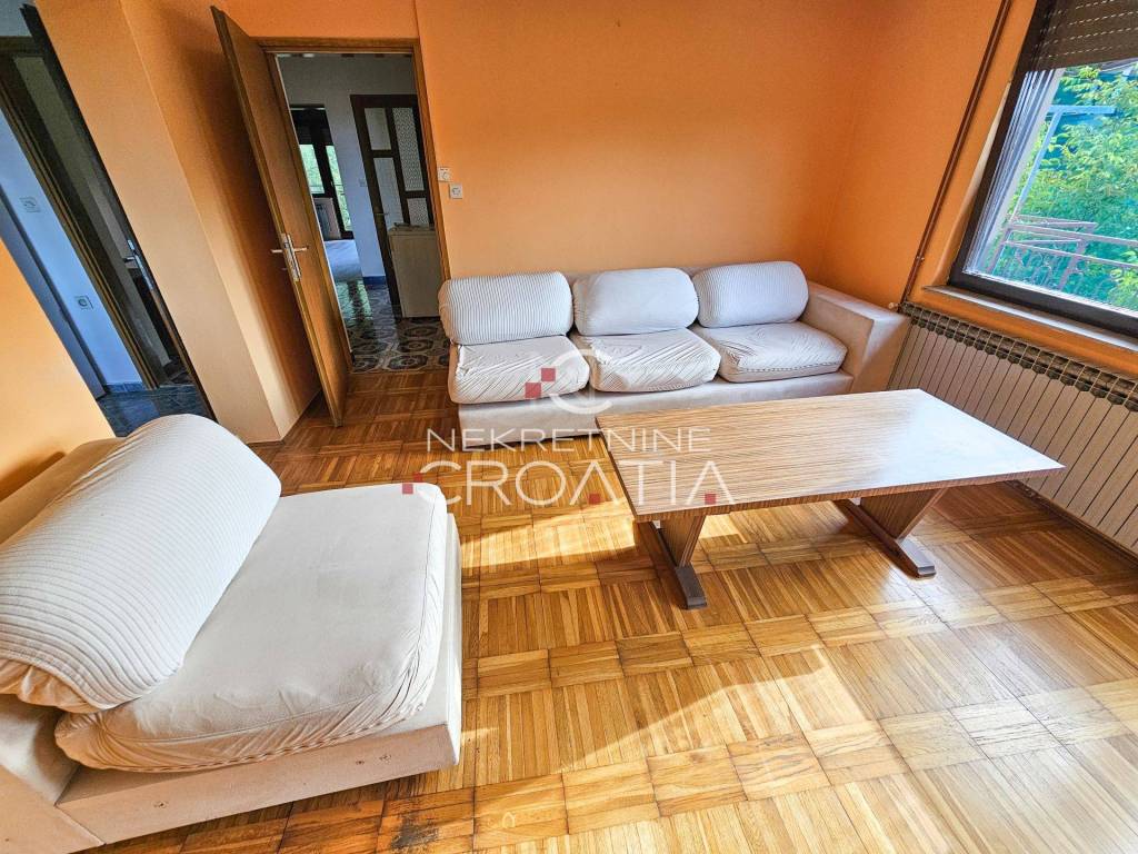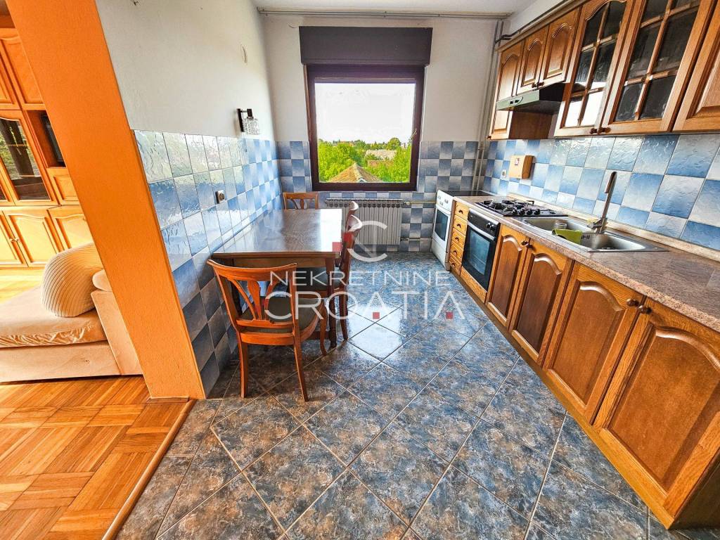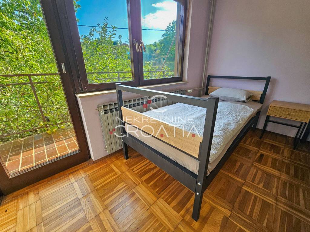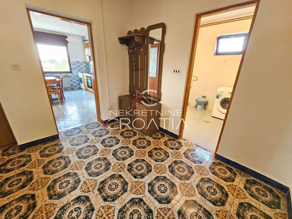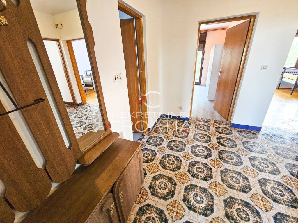 Prostrani stan na 1. katu kuće u kojoj nitko ne živi: stan je površine 100 m2 + podrumsko spremište, natkriveno parkirno mjesto i mogućnost korištenja cijele ograđene okućnice površine 1.283 m2. Iznajmljuje se dugoročno, minimalno na 1 godinu. Idealan stan za obitelj ili za smještaj više osoba/ radnika. Etažno plinsko centralno grijanje, klimatiziran. Udaljenost od Doma zdravlja 600 m, 1.9 km od osnovne škole. PROSTORIJE: - hodnik - kuhinja sa blagovaonicom - ostava - dnevni boravak - soba I (3-krevetna) - soba II (3-krevetna) - balkon I - balkon II - kupaonica sa WC-om