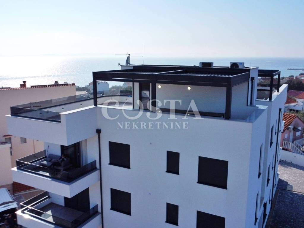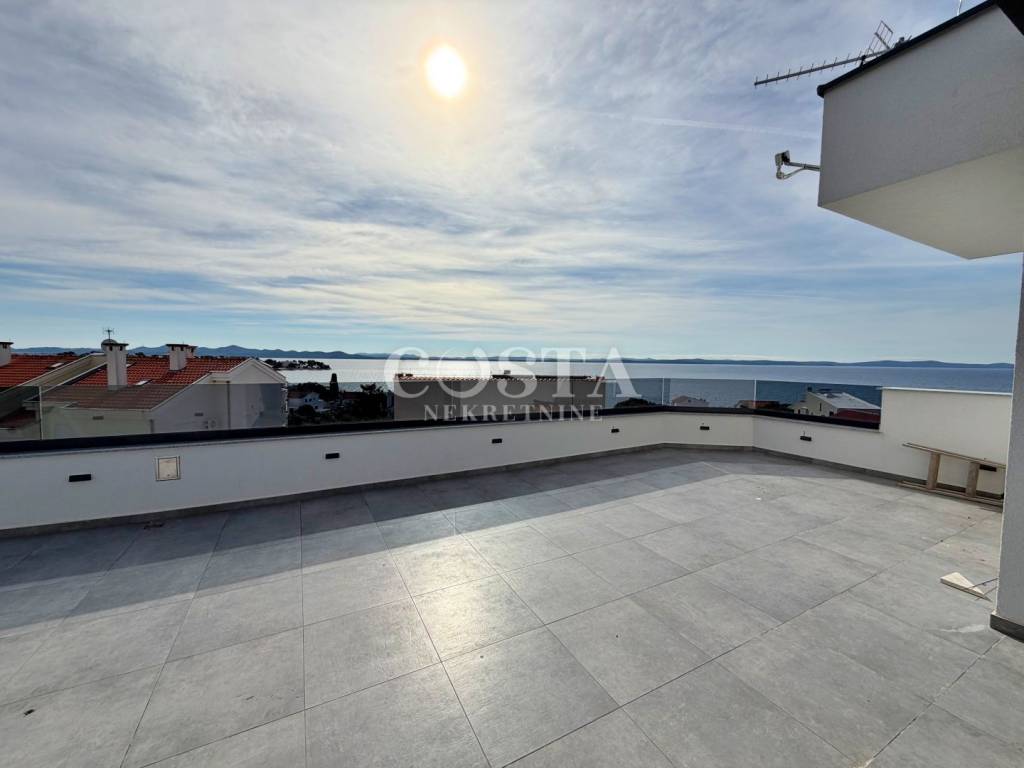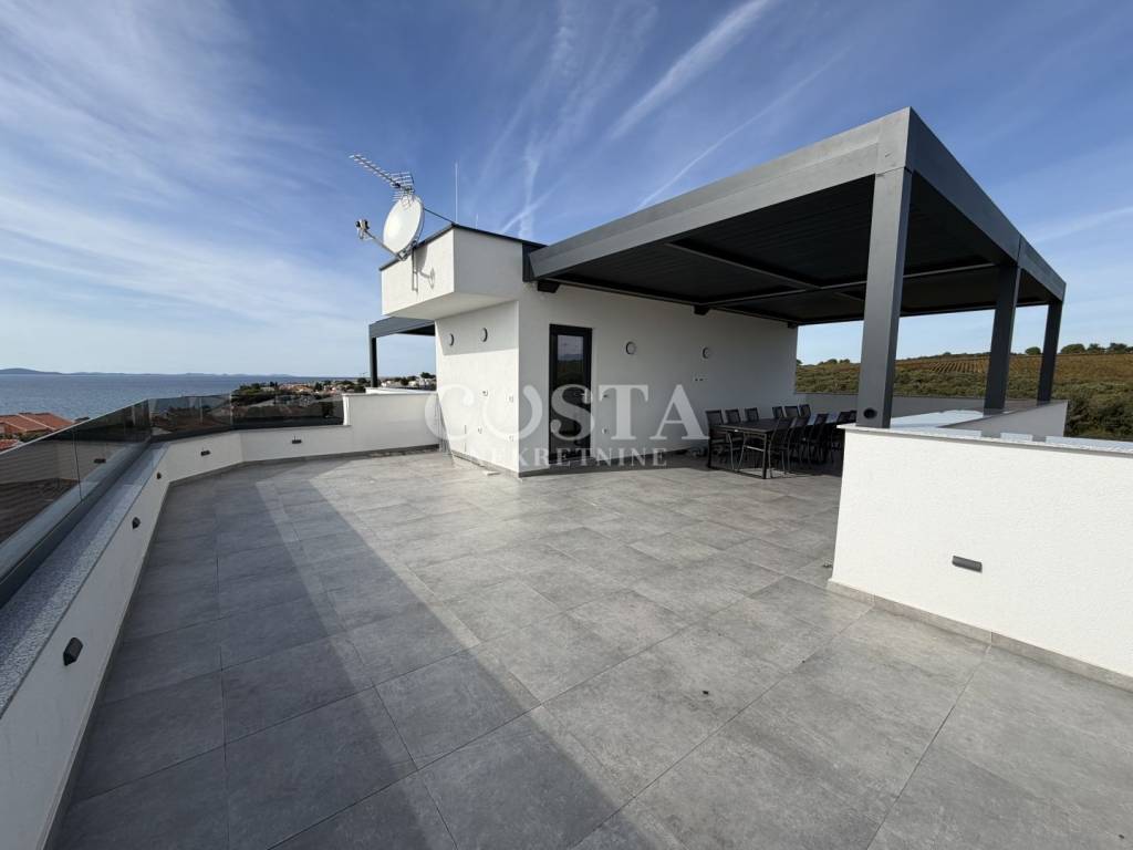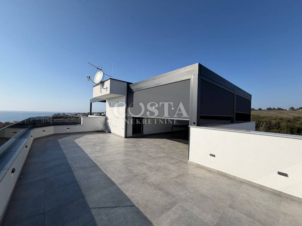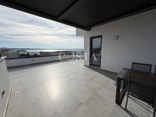 Prodaje se penthouse s impresivnim pogledom na more u mjestu Petrčane kraj Zadra. Stan od 67 m2 se nalazi na drugom katu manje stambene zgrade sa 6 jedinica. Sastoji se od dnevnog boravka, kuhinje i blagovaonice, dvije spavaće sobe, kupaonice, dodatnog wc-a i hodnika te terase od dodatnih 10 m2 s koje se pruža pogled na more. Stanu pripada i prostrana krovna terasa od 70 m2 na kojoj se nalazi i pergola, te dva parkirna mjesta u dvorištu zgrade. Sveukupna korisna površina stana zajedno sa svim pripacima iznosi 186,05 m2 (K.V. 97,78 m2).