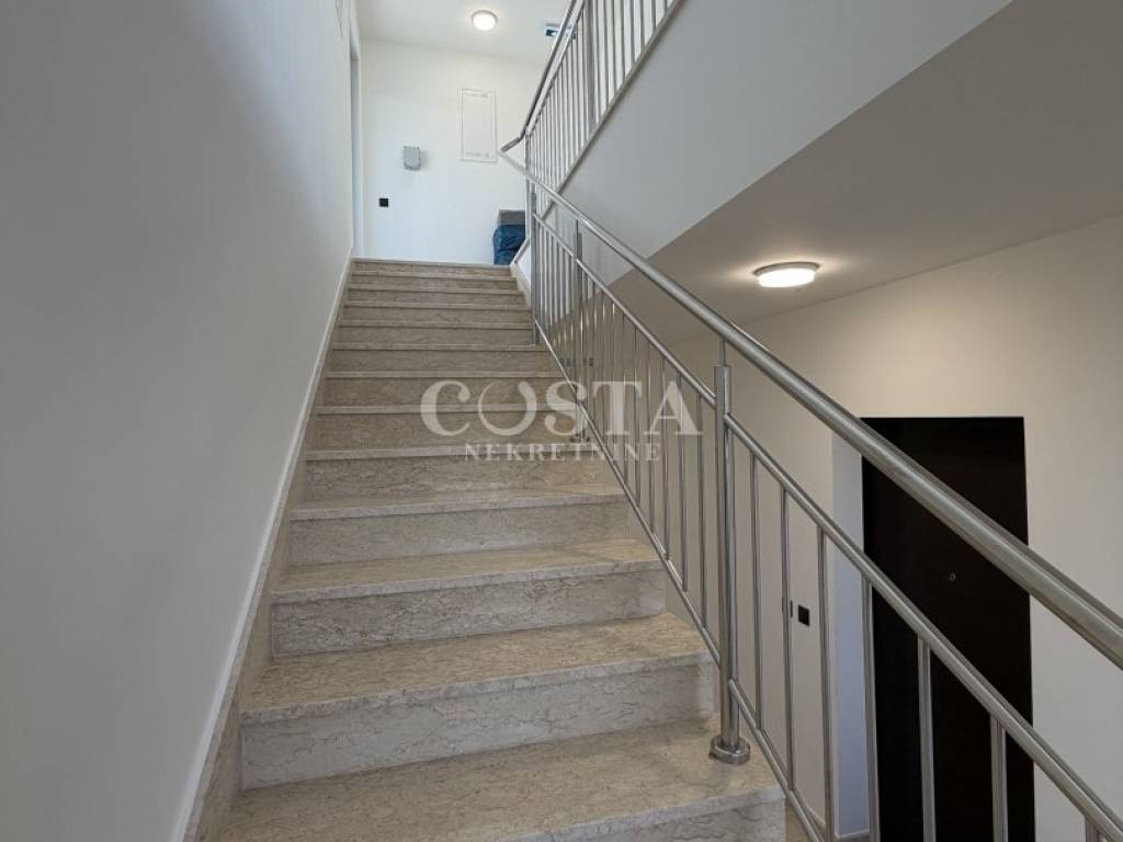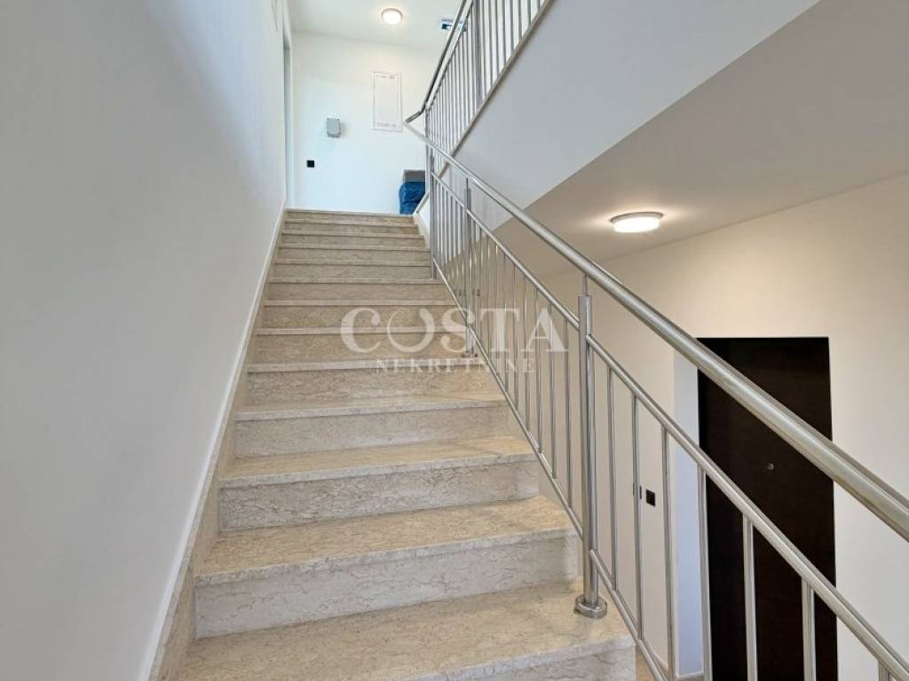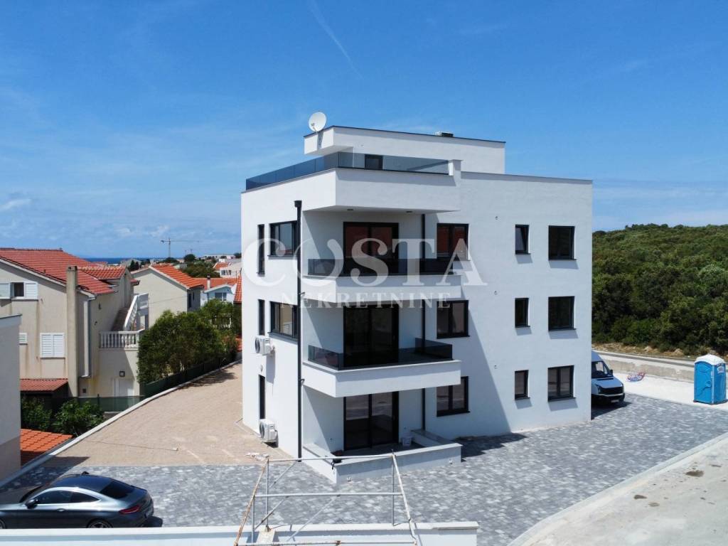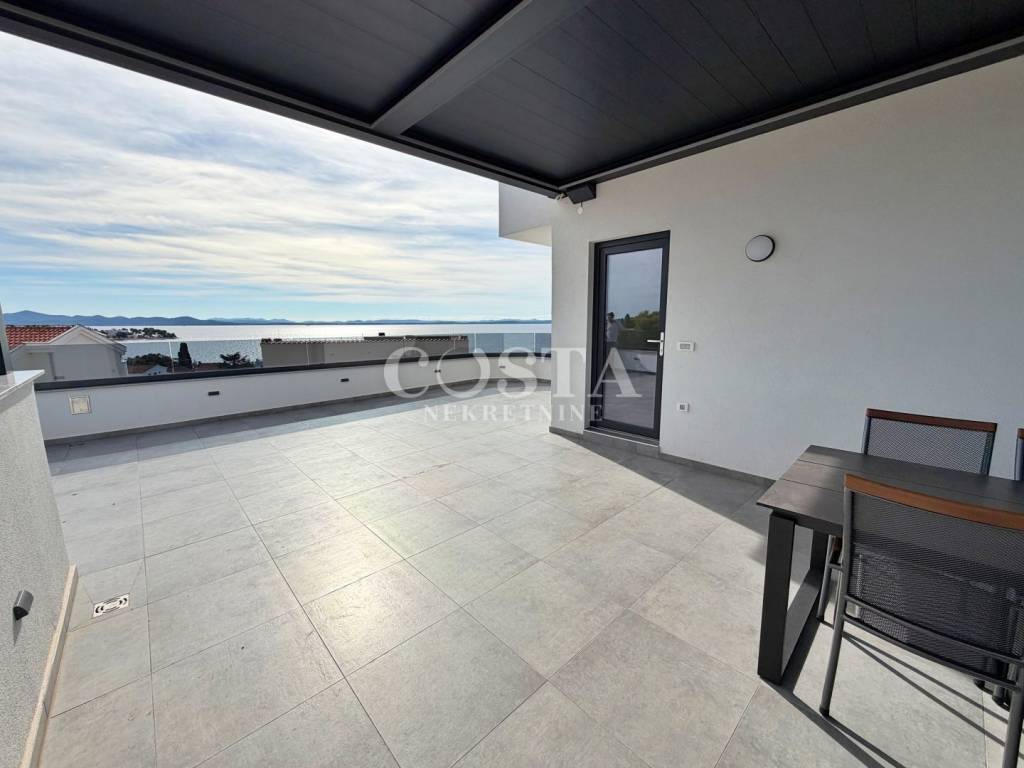 Prodaje se penthouse s impresivnim pogledom na more u mjestu Petrčane kraj Zadra. Stan od 67 m2 se nalazi na drugom katu manje stambene zgrade sa 6 jedinica. Sastoji se od dnevnog boravka, kuhinje i blagovaonice, dvije spavaće sobe, kupaonice, dodatnog wc-a i hodnika te terase od dodatnih 10 m2 s koje se pruža pogled na more. Stanu pripada i prostrana krovna terasa od 70 m2 na kojoj se nalazi i pergola, te dva parkirna mjesta u dvorištu zgrade. Sveukupna korisna površina stana zajedno sa svim pripacima iznosi 186,05 m2 (K.V. 97,78 m2).