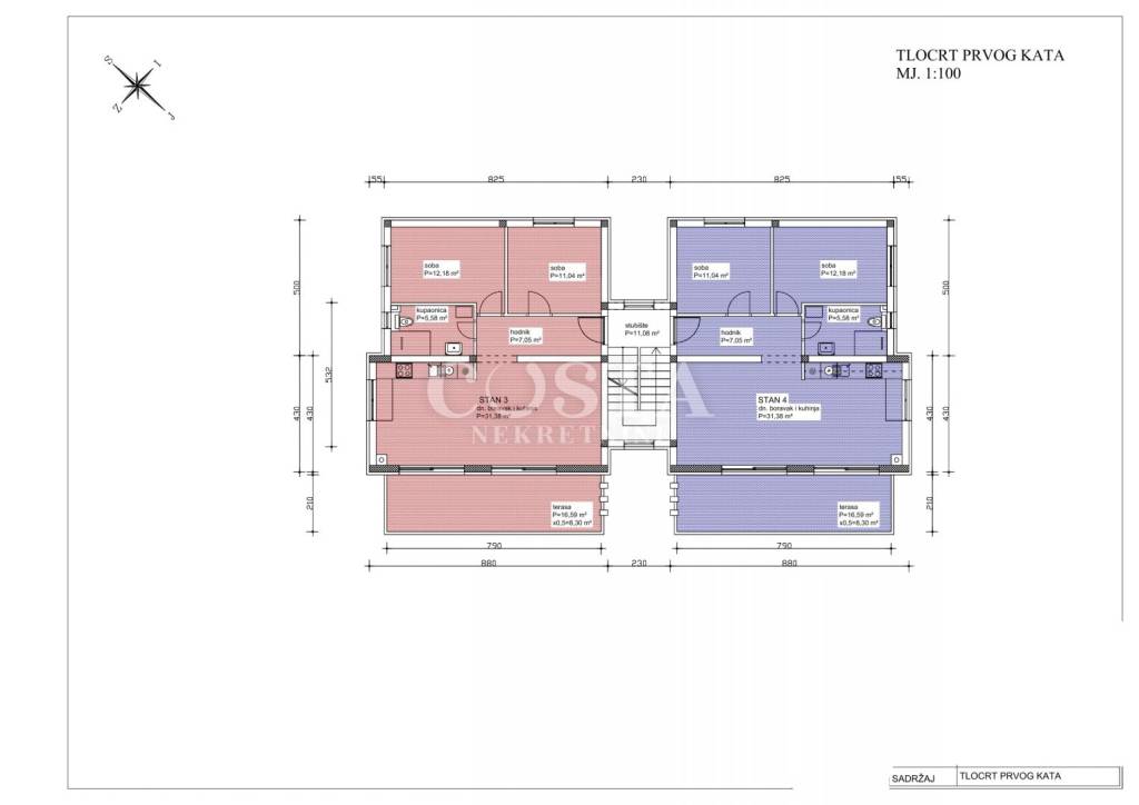 Prodaje se stan u izgradnji u mjestu Sukošan pokraj Zadra. Stan površine 67,23 m2 nalazi se na katu manje stambene zgrade od 6 jedinica. Sastoji se od prostranog dnevnog boravka, kuhinje i blagovaone, dvije spavaće sobe, kupaonice, hodnika i terase od dodatnih 16,59 m2. Stanu pripada i parkirno mjesto u dvorištu zgrade. Sveukupna prodajna površina stana zajedno sa svim pripacima iznosi 78 m2. Stan je klimatiziran, a provedeno je i podno grijanje.