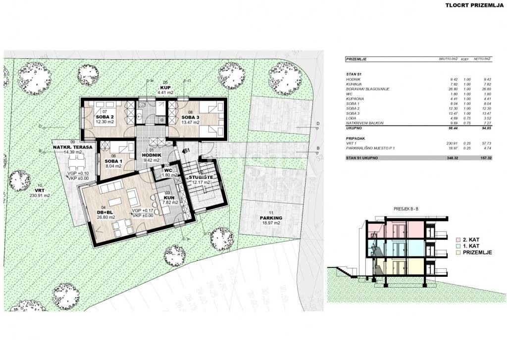 Prodaje se prostrani stan u izgradnji u mjestu Rovanjska u Zadarskoj županiji. Stan površine 84,06 m2 nalazi se u prizemlju manje stambene zgrade sa tri jedinice. Sastoji se od dnevnog boravka, kuhinje i blagovaonice, tri spavaće sobe, kupaonice, dodatnog wc-a te lođe od dodatnih 4,69 m2 i natkrivenog balkona od 9,69 m2. Stanu pripada i vrt od 230 m2 te parkirno mjesto u dvorištu zgrade, pa sveukupna prodajna površina stana zajedno s pripacima iznosi 157,32 m2.