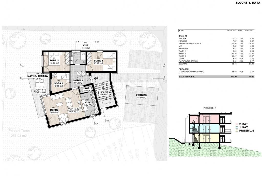 Prodaje se prostrani stan u izgradnji u mjestu Rovanjska u Zadarskoj županiji. Stan površine 84,06 m2 nalazi se na prvom katu manje stambene zgrade sa tri jedinice. Sastoji se od dnevnog boravka, kuhinje i blagovaonice, tri spavaće sobe, kupaonice, dodatnog wc-a te lođe od dodatnih 4,69 m2 i natkrivenog balkona od 9,69 m2. Stanu pripada i parkirno mjesto u dvorištu zgrade, pa sveukupna prodajna površina stana zajedno s pripacima iznosi 98,50 m2.