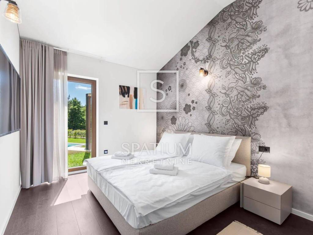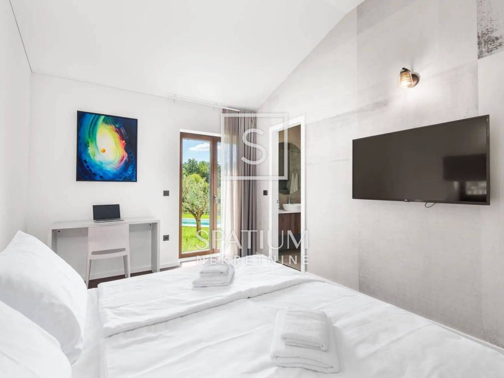 VIŠNJAN, u ponudu smo dobili ovu iznimnu kuću s bazenom, smještenu u mirnom ruralnom okruženju koje nudi savršen spoj privatnosti i udobnosti. Pažljivo projektiran interijer uređen je u toplim, prirodnim tonovima, čime je postignut skladan spoj elegancije i ugodne atmosfere. Otvoreni dnevni prostor povezuje udoban dnevni boravak, blagovaonicu i modernu kuhinju, s izravnim izlazom na prostranu terasu. U vanjskom dijelu smješten je grijani bazen sa sunčalištem – idealno mjesto za opuštanje i uživanje tijekom cijele godine.
