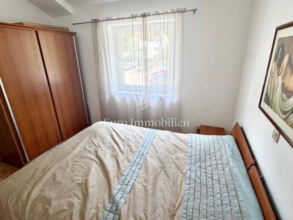 U uvali Soline na otoku Krku, nekoliko koraka od plaže, nalazi se apartman na drugom katu stambene zgrade. Sastoji se od hodnika, dnevnog boravka s blagovaonicom i kuhinjom s ostavom, dvije spavaće sobe i kupaonice. Natkrivena terasa ima otvoren pogled na more.