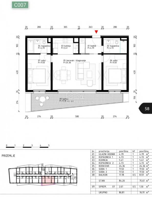 Stan C007 sastoji se od ulaznog hodnika/garderobe, kupaonice, 2 spavaće sobe sa izlazima na terasu do kojih glavna spavaća soba ima vlastitu kupaonicu, te dnevnog boravka po open space konceptu, koji je osvijetljen velikom staklenom stijenom kroz koju se pristupa velikoj terasi okrenutoj prema šumi i prirodi.