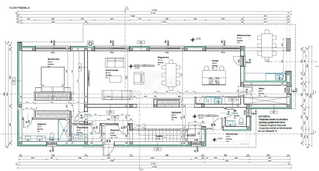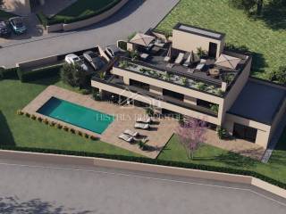 U prizemlju modernog koncepta otvorenog tipa smjestio se dnevni boravak sa kuhinjom i blagovaonicom bogato osvijetljen putem velikih staklenih stijena, povezan sa terasom gdje se nalazi ljetna kuhinja i grijani bazen. Na ovoj etaži imamo još spavaću sobu sa vlastitom kupaonicom i terasom, dodatni toalet, praonicu, ostavu u kuhinji i kotlovnicu sa vanjskim ulazom. Kroz manji hodnik dolazimo do stubišta kojim se penjemo na kat gdje su smještene 3 velike spavaće sobe sa kupaonicama i terasama sa kojih se pruža lijepi pogled na more. Na zadnjoj etaži idealnoj za relax zonu i uživanje izlazimo na prostranu krovnu terasu sa nadstrešnicom, ispod koje su smješteni jacuzzi i sauna sa sunčalištem i fantastičnim panoramskim pogledom na more.