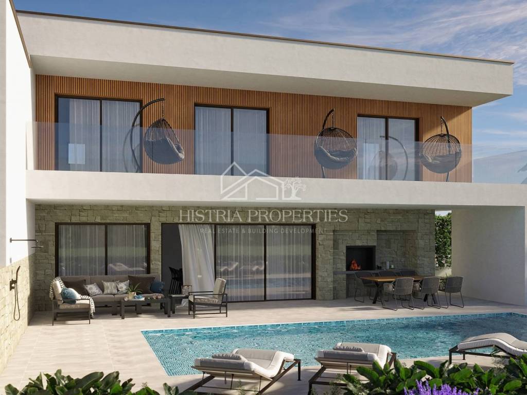 Na izuzetno atraktivnoj i traženoj lokaciji smjestila se ova stilski upečatljiva dvojna kuća sa bazenom i pogledom na more koji se pruža sa obje etaže.