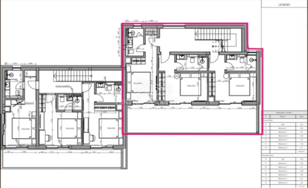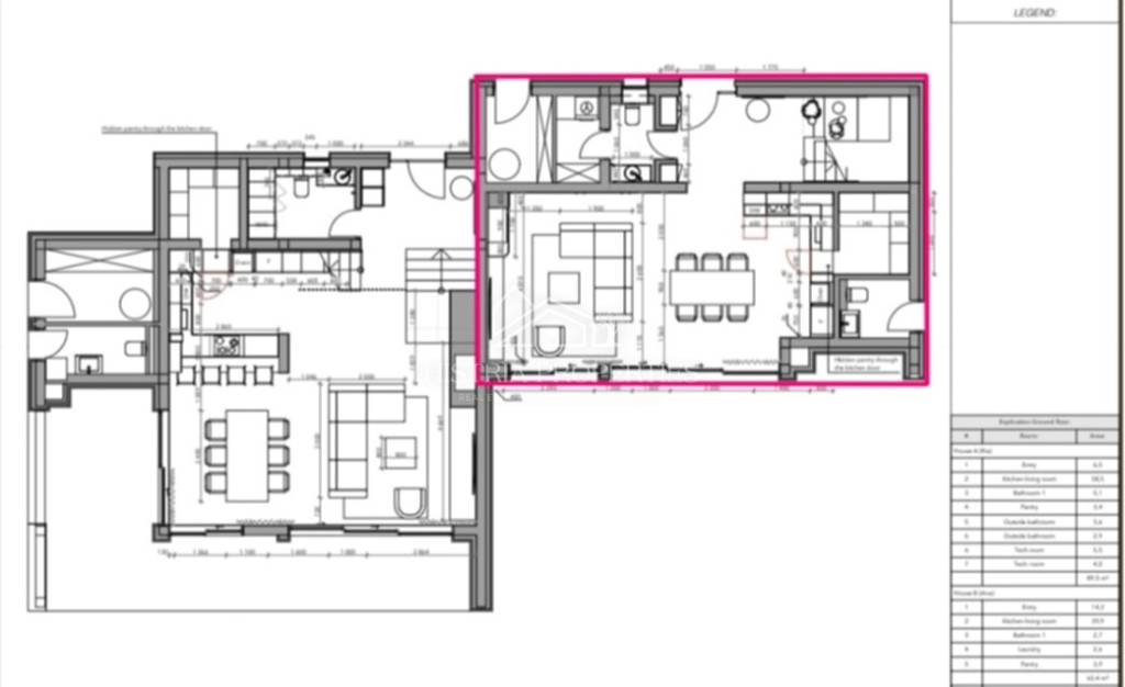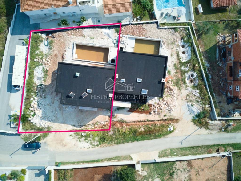 Prizemlje se sastoji od otvorenog dnevnog boravka, kuhinje i blagovaone sa velikim staklenim stijenama, povezanim sa natkrivenom terasom, grijanim bazenom i sunčalištem oko njega. U ovoj fazi gradnje investitor je ostavio mogućnost spajanja i postavljanja staze između oba objekta, ukoliko bi se netko odlučio na kupnju dvaju fantastičnih kuća sa izuzetnim potencijalom za objedinjenje što bi zaokružilo cijelu priču. Na ovoj etaži se nalazi još gostinjski toalet, tehnička soba, kotlovnica i vanjski toalet. Na katu se nalaze 3 spavaće sobe sa vlastitim kupaonicama te izlazima na terasu sa koje se proteže umirujući pogled na prekrasne zalaske sunca i more.