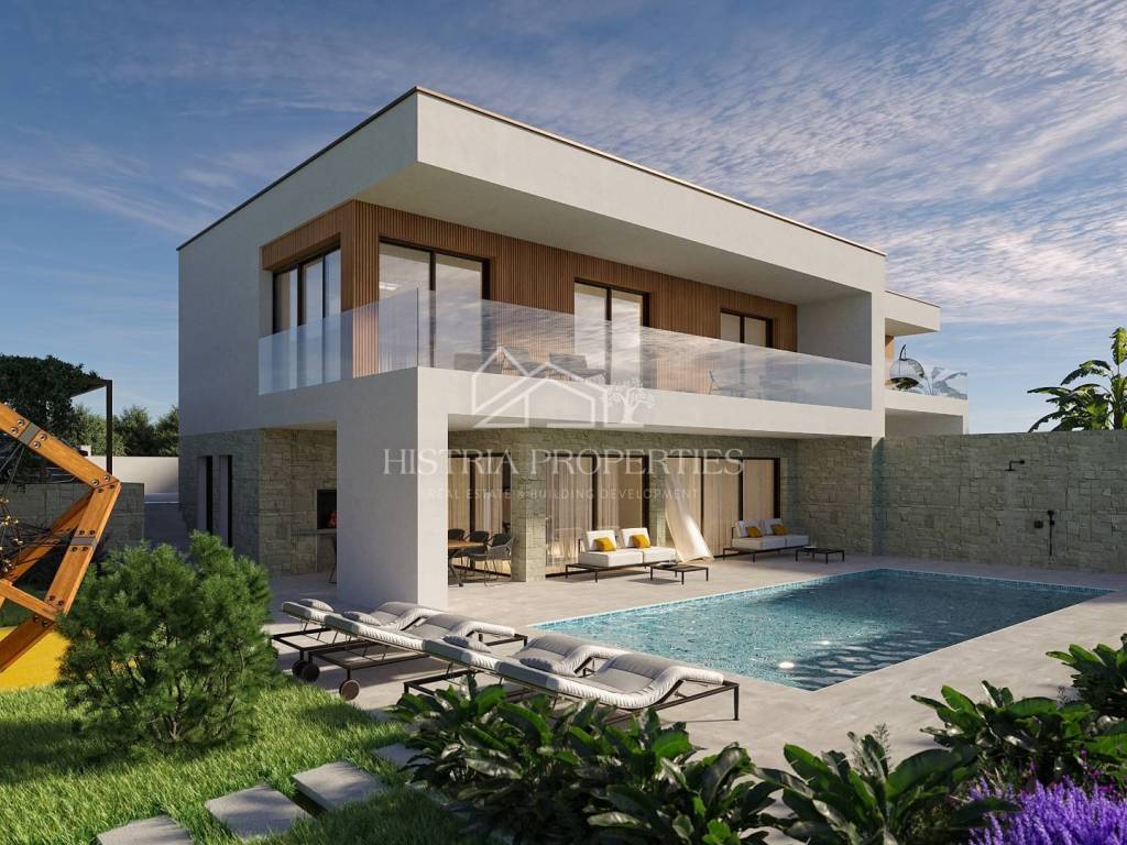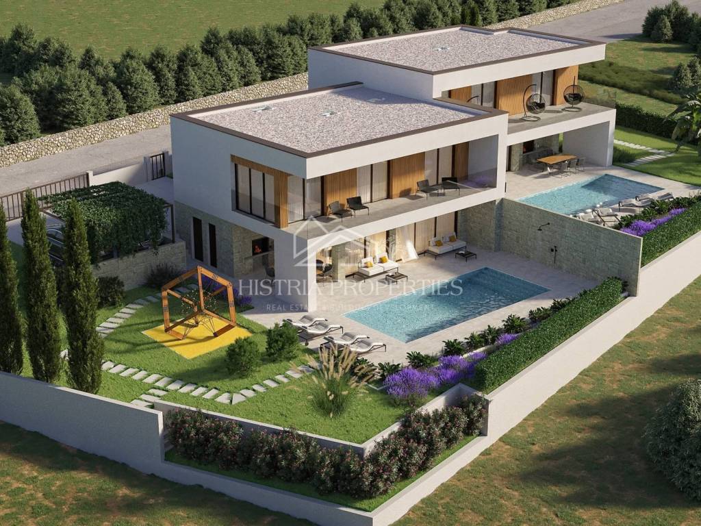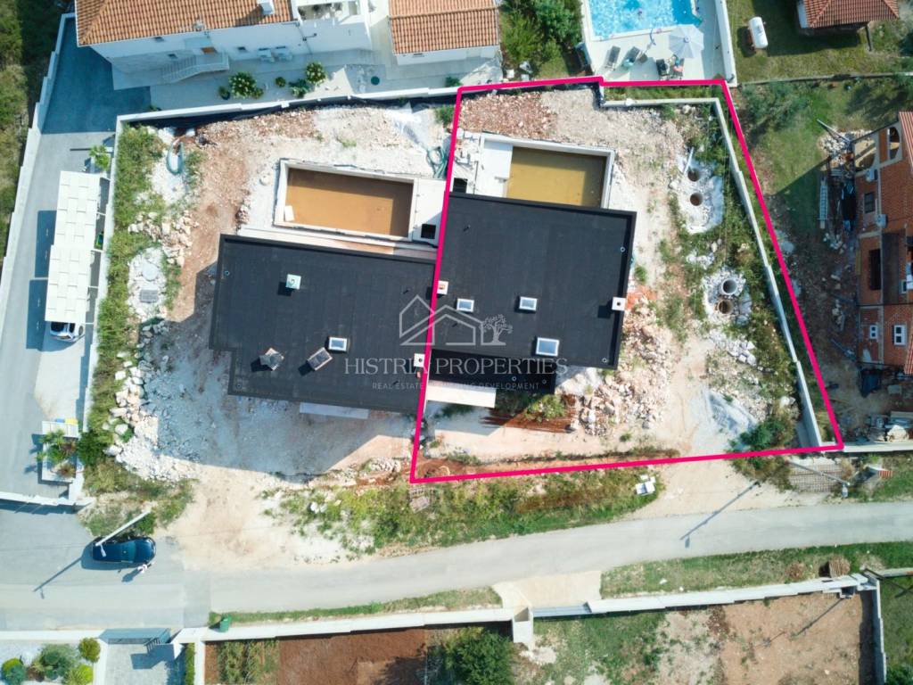 Prizemlje vile sastoji se od otvorenog dnevnog boravka, kuhinje i blagovaone sa velikim staklenim stijenama, povezanim sa natkrivenom terasom, grijanim bazenom i sunčalištem oko njega. U ovoj fazi gradnje investitor je ostavio mogućnost spajanja i postavljanja staze između oba objekta, ukoliko bi se netko odlučio na kupnju dvaju fantastičnih kuća sa izuzetnim potencijalom za objedinjenje što bi zaokružilo cijelu priču. Na ovoj etaži se nalazi još gostinjski toalet, tehnička soba, kotlovnica i vanjski toalet. Na katu se nalaze 3 spavaće sobe sa vlastitim kupaonicama te izlazima na terasu sa koje se proteže umirujući pogled na prekrasne zalaske sunca i more.