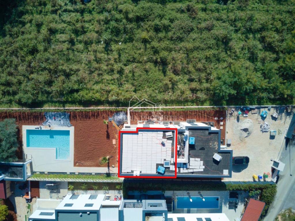 Stan se sastoji od dnevnog boravka, kuhinje i blagovaonice otvorenog tipa povezane sa natkrivenim balkonom koji vodi na prostranu krovnu terasu sa bio klimatskom pergolom, vanjskom kuhinjom, tušem i jacuzzijem. U stanu se još nalaze 2 spavaće sobe i kupaonica.