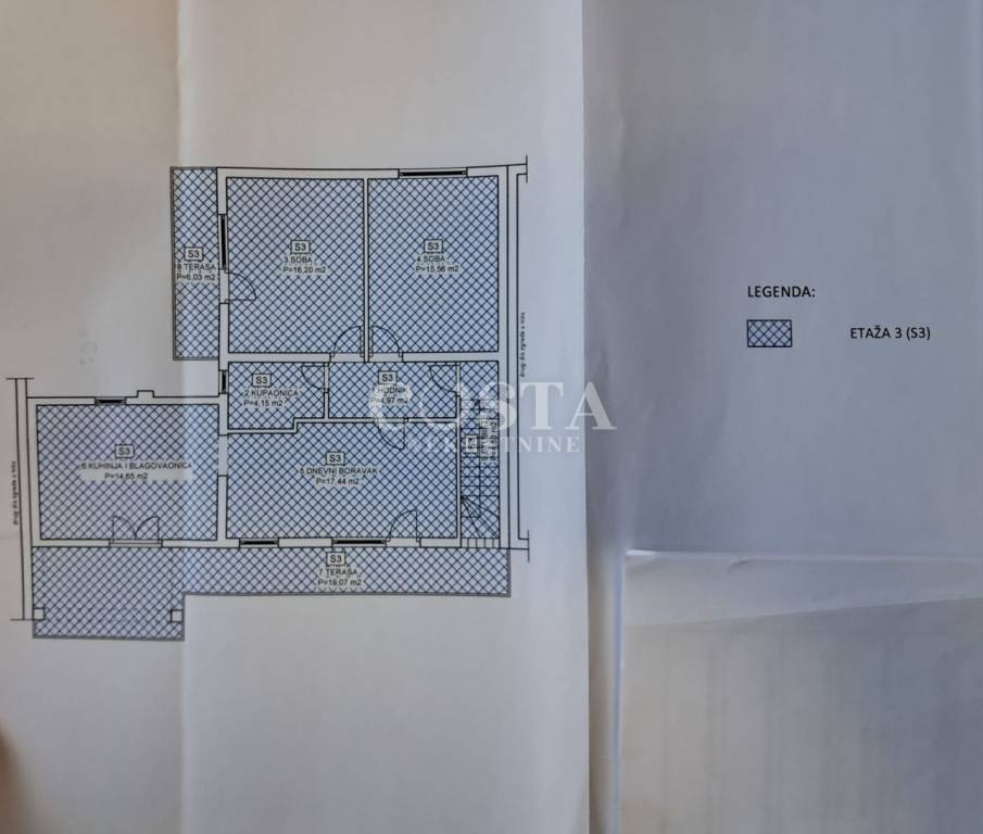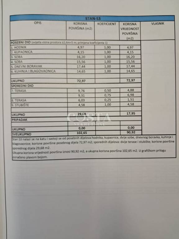 Stan 3 smješten je na katu i sastoji se od hodnika, kupaonice, en-suite kupaonice, dvije sobe, dnevnog boravka s kuhinjom i blagovaonicom. Korisna površina posebnog dijela iznosi 72,97 m², dok sporedni dijelovi, koji uključuju dvije terase i stubište, imaju ukupno 29,68 m². Ukupna korisna vrijednost površina iznosi 90,92 m², a ukupna korisna površina 102,65 m².