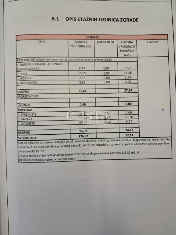 Stan 1 smješten je u suterenu i podijeljen je u dva stana od kojih se oboje sastoje od dnevnog boravka s kuhinjom i blagovaonicom, jedne sobe, hodnika i kupaonice, ukupne korisne površine posebnog dijela 31,04 m². Stanu pripadaju spremište, garaža i dvorište ukupne korisne površine 95,33 m². Ukupna korisna površina stana zajedno sa svim pripacima iznosi 126,37 m². (K.V. 52, 11 m2)