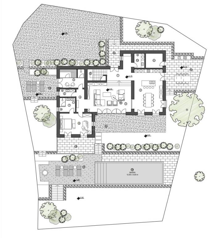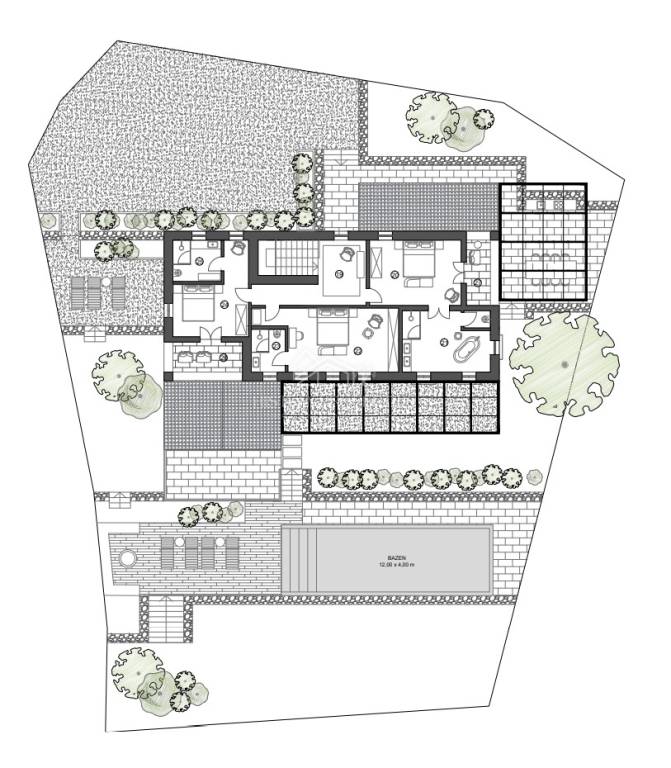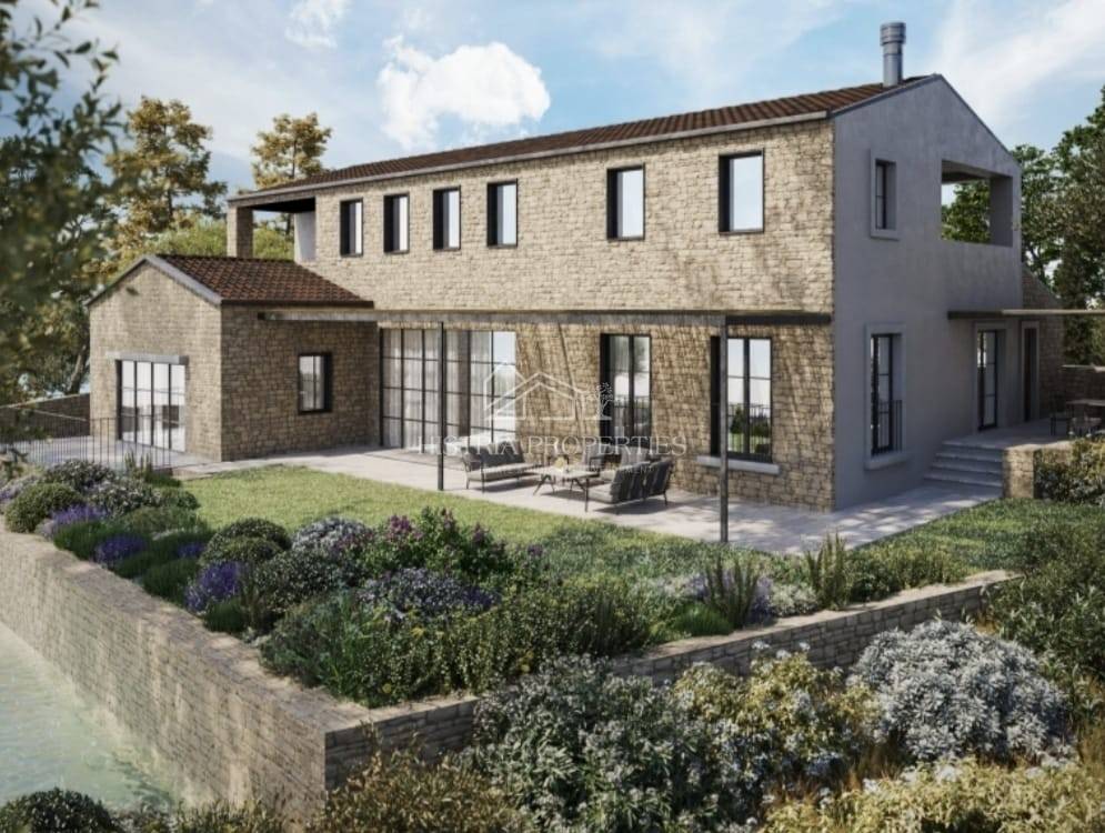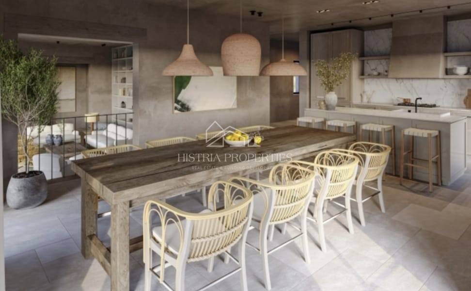 Ova vila sastoji se od otvorenog dnevnog prostora koji obuhvaća modernu kuhinju, blagovaonicu i dnevni boravak koji je ostakljen velikim stijenama te povezuje unutrašnjost vile sa vanjskim sadržajima poput bazena koji je utopljen u ovaj predivni krajolik, atraktivnog sunčališta, ljetne kuhinje i lijepo uređenog dvorišta. Dodatna zona za opuštanje je dio kuće sa unutarnjim wellness prostorom (sauna, jacuzzi i tuš) te vlastitim vanjskim dnevnim boravkom. 4 komforne spavaće sobe sa vlastitim kupaonicama od kojih glavna spavaća soba ima i kadu za opuštanje u kupaonici a 3 spavaće sobe imaju vlastite terase koje će upotpuniti ovu predivnu priču.