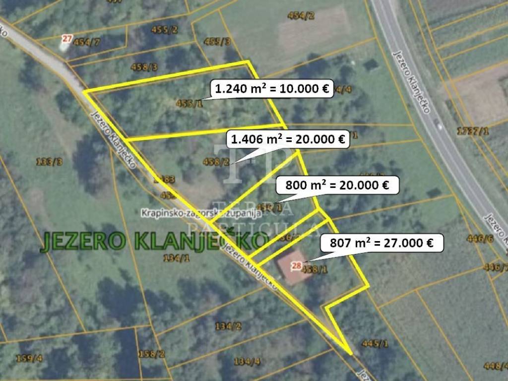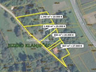 Na prodaju su tri građevinska zemljišta. Površine su im 1.241 m², 800 m² i 1.406 m². Nalaze se uz kuću u gradnji na adresi Jezero Klanječko 28, Veliko Trgovišće pri asfaltiranoj cesti uz koju su svi priključci. Iskazana cijena je za zemljište k.č.br. 455/1.