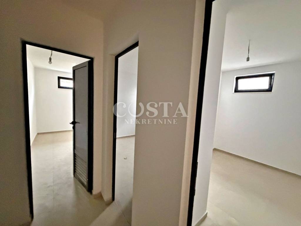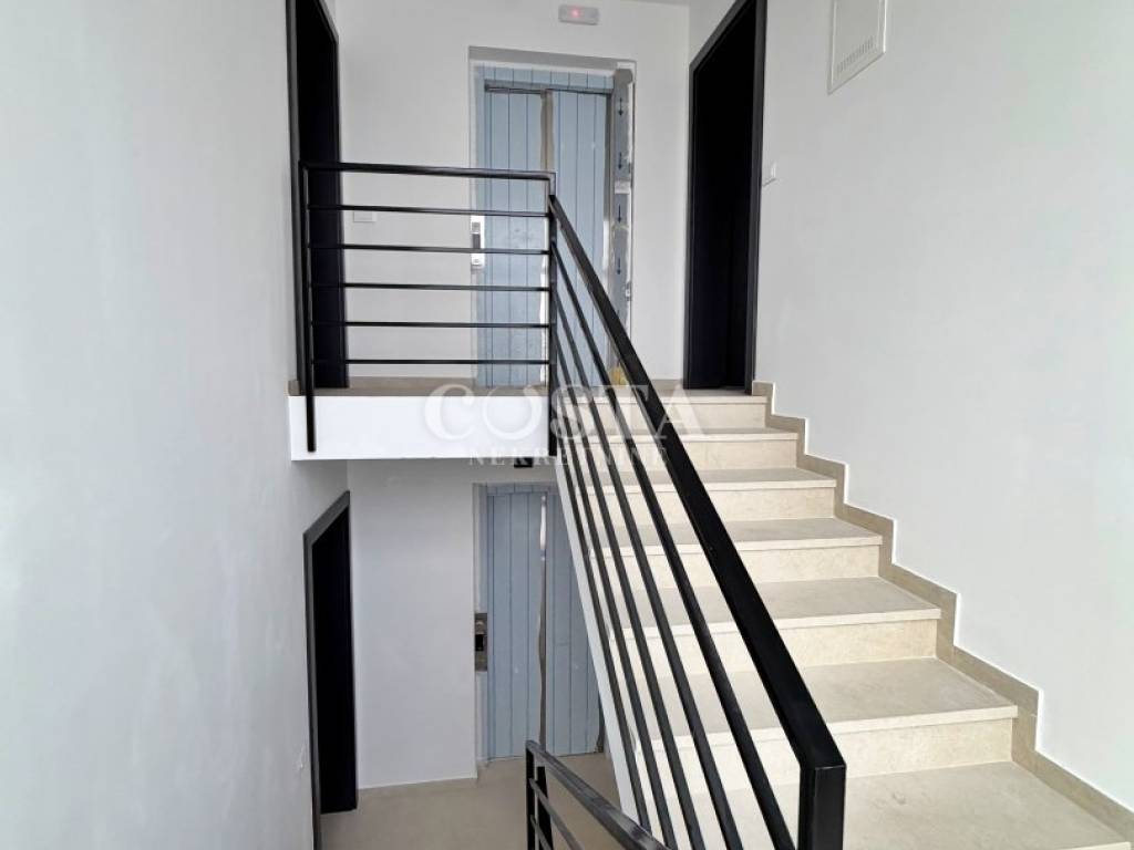 Prodaje se dvoetažni stan s vrtom u novogradnji u Sukošanu pokraj Zadra. Stan stambene površine 101,10 m2 nalazi se u prizemlju manje stambene zgrade sa šest jedinica i liftom. Sastoji se od podrumske prostorije, radne sobe površine 38 m2 povezane unutarnjim stubište sa prizemnim dijelom stana s dnevnim boravkom, kuhinjom i blagovaonicom, dvije spavaće sobe, dvije kupaonice i hodnika površine 63,10 m2. Stanu pripada i spremište od 12,40 m2, prostrani vrt od 73,25 m2 te parkirno mjesto u dvorištu zgrade. Ukupna korisna površina stana zajedno sa svim pripacima iznosi 203,36 m2 (K.V. 114,15 m2).