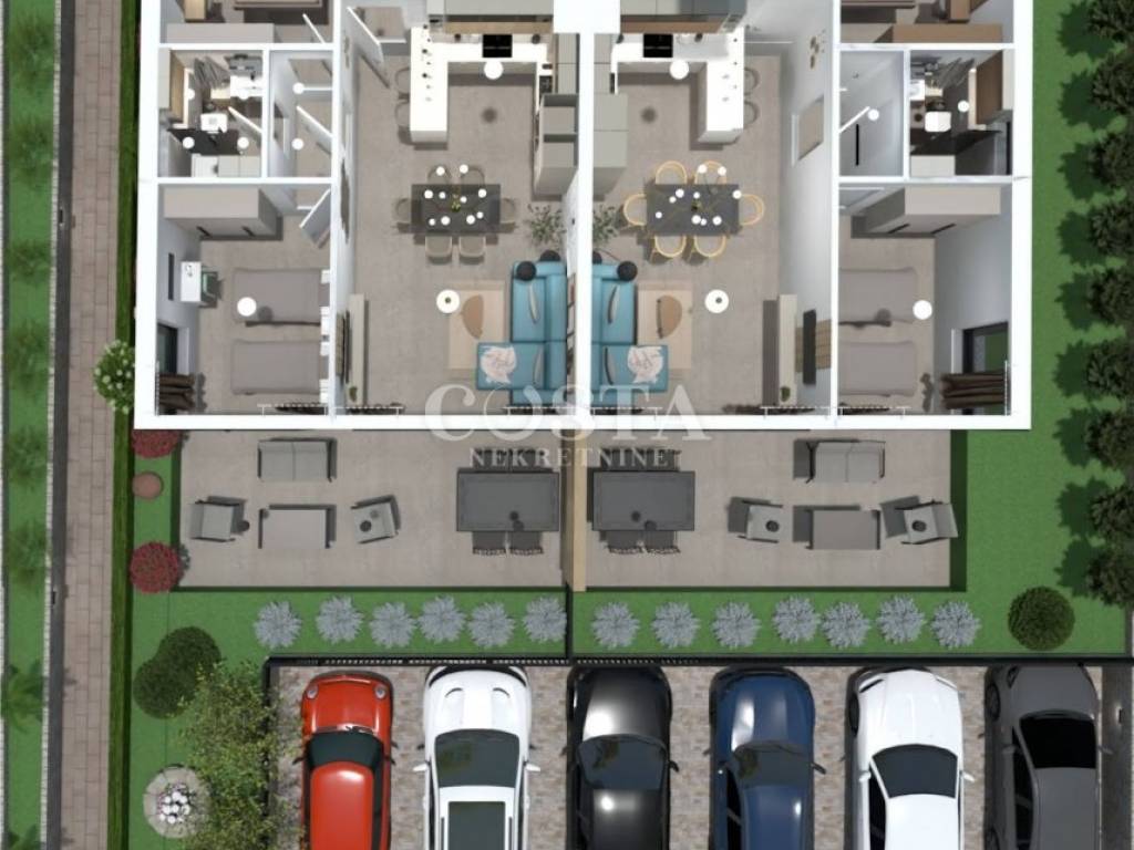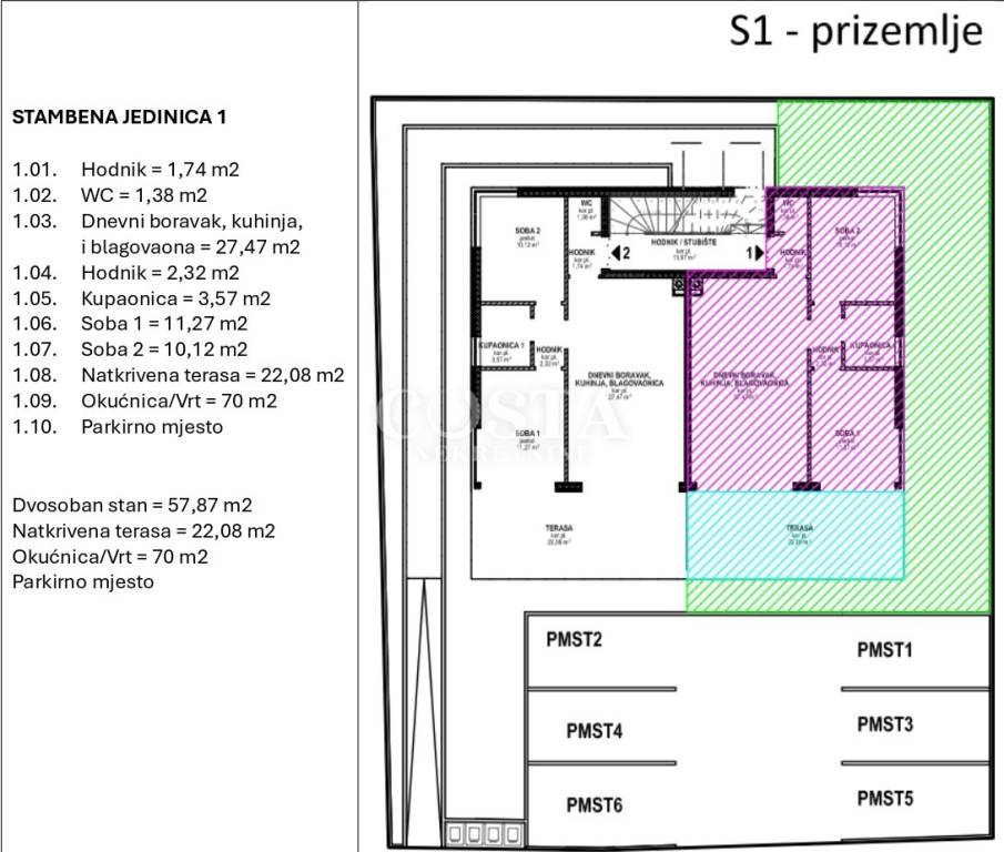 Prodaje se dvosobni stan s vrtom u novogradnji u mjestu Povljana na otoku Pagu. Stan površine 57,87 m2 nalazi se u prizemlju manje stambene zgrade sa šest jedinica. Sastoji se od dnevnog boravka, kuhinje i blagovaonice, dvije spavaće sobe, kupaonice, dodatnog wc-a i hodnika, te natkrivene terase od dodatnih 22 m2. Stanu pripada i vrt od 70 m2 te privatno parkirno mjesto u dvorištu zgrade. Sveukupna korisna površina stana zajedno s pripacima iznosi 163,7 m2 (K.V. 78,86 m2).