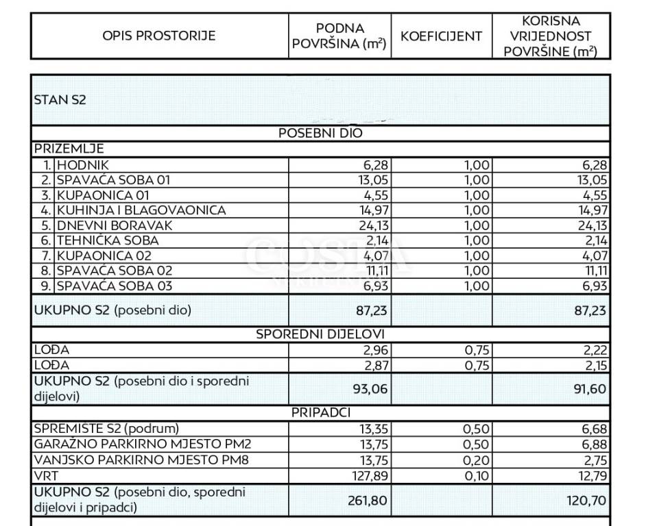 Prodaje se stan u izgradnji u Diklu u Zadru. Stan površine 87,23 m2 nalazi se u prizemlju manje stambene zgrade sa četiri jedinice u ekskluzivnom kompleksu luksuzne novogradnje. Sastoji se od dnevnog boravka, kuhinje i blagovaone, tri spavaće sobe, dvije kupaonice, hodnika te dvije lođe od dodatnih 2,87 m2 i 2,96 m2. Stanu pripada i vrt od 127,89 m2, spremište od 13,35 m2, jedno vanjsko te jedno garažno parkirno mjesto. Ukupna korisna površina stana zajedno sa svim pripacima iznosi 261,80 m2 (K.V. 120,70 m2).