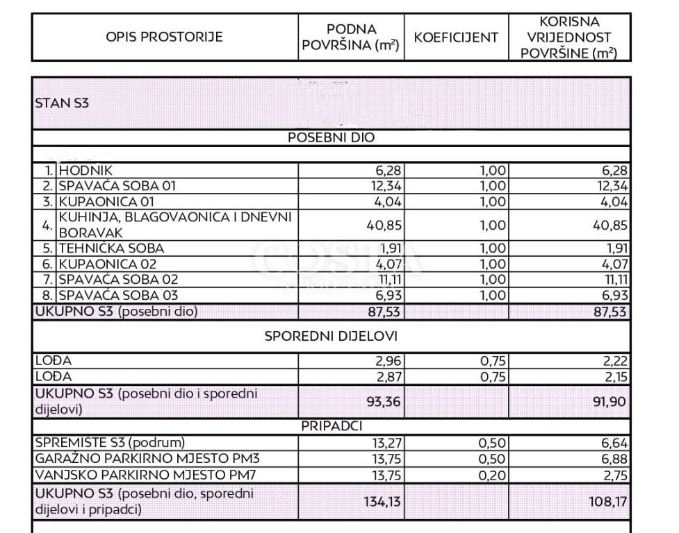 Prodaje se stan u izgradnji u Diklu u Zadru. Stan površine 87,53 m2 nalazi se na katu manje stambene zgrade sa četiri jedinice u ekskluzivnom kompleksu luksuzne novogradnje. Sastoji se od dnevnog boravka, kuhinje i blagovaone, tri spavaće sobe, dvije kupaonice, hodnika te dvije lođe od dodatnih 2,87 m2 i 2,96 m2. Stanu pripada i spremište od 13,27 m2, jedno vanjsko te jedno garažno parkirno mjesto. Ukupna korisna površina stana zajedno sa svim pripacima iznosi 134,13 m2 (K.V. 108,17 m2).