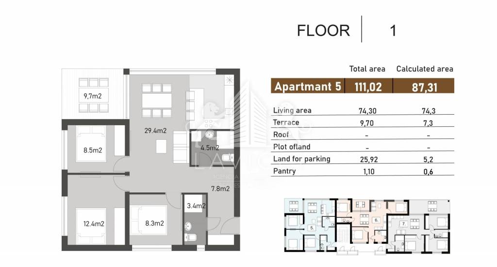 Apartman oznake S-5 nalazi se na 1. katu. Ukupna tlocrtna površina iznosi 84m2, a sastoji se od ulaznog dijela (hodnika), 3 spavaće sobe, kupaonice s toaletom, gostinjskog wc-a, dnevnog dijela u kojem su smješteni kuhinja s blagovaonicom i dnevni boravak, te natkrivena terasa. Na istom katu, ispred ulaza u stan, nalazi se spremište površine 1,10m2, dok su ispred zgrade dva parkirna mjesta.