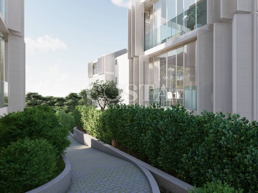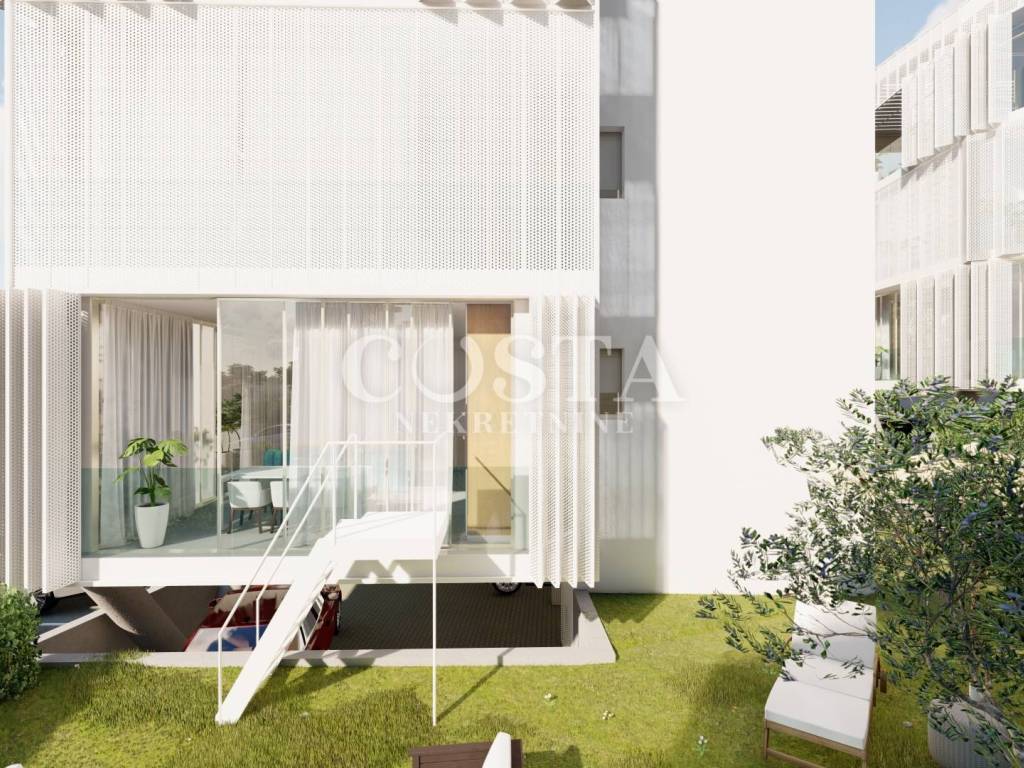 U izgradnji su korišteni visokokvalitetni materijali poput termoizolacije na fasadi te aluminijske stolarije s ugrađenim elektroroletnama i komarnicima. Stan je opremljen protupožarnim i protuprovalnim vratima. Za podne obloge korištene su keramičke pločice prve klase, a podno grijanje na vodu provedeno je u čitavom stanu putem dizalica topline. Stan je kompletno klimatiziran putem stropnih klima.